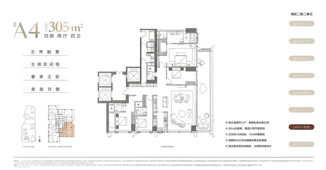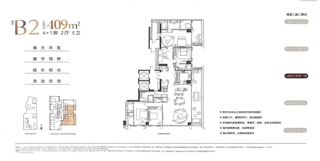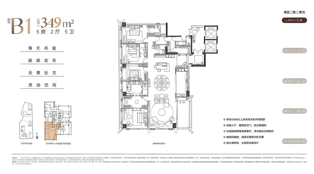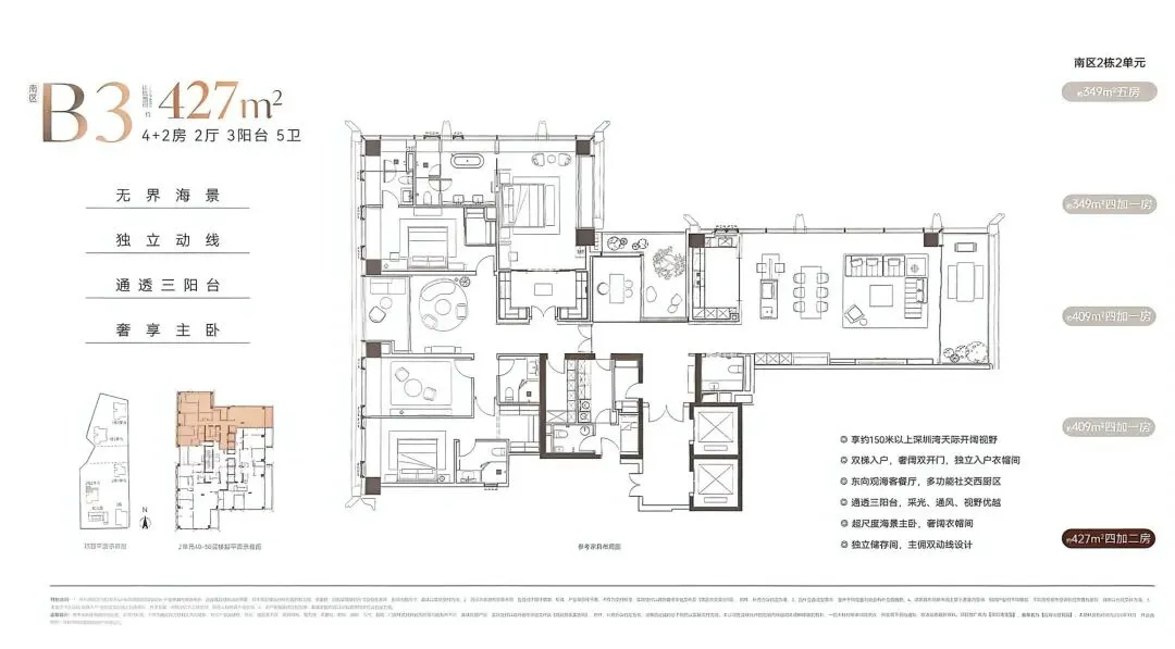 最后一栋参考价格及折扣优惠:澐玺南区首推2栋2单元备案总价3250万-1个亿左右,单价约15-24万/㎡!共162套216-287-295-305-345-409-430㎡。