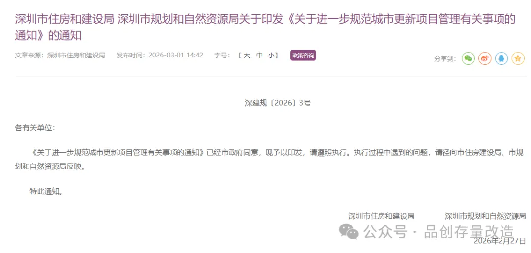 2026年3月1日,深圳市住房和建设局及深圳市规划和自然资源局联合印发《关于进一步规范城市更新项目管理有关事项的通知》,通过调整土地移交率、保障房配建、“清调供”,并统筹多方力量等途径,推动更新项目实施: