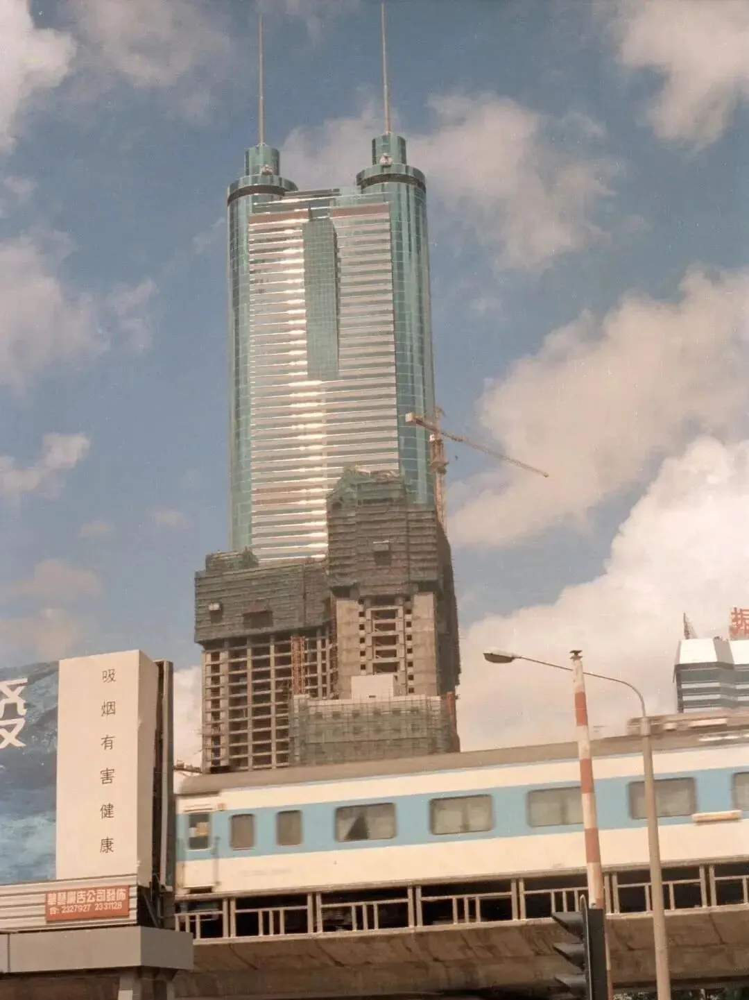 这一幕看着熟?还是地王大厦,只不过这时已经亭亭玉立,蓝玻璃像水洗过一样亮,底下小巴一排排等着拉活,四周广告牌和大字板都塞满了马路边沿,那些“XX银行”、各种楼盘介绍,听爸妈讲那会儿深圳站台、公交、写字楼的大广告全靠一个“高”字压人,真不是现在噱头多、图片多的风格,就靠那几行大字支着牌匾。