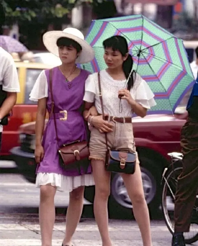 再看看这俩街头姑娘,一个紫裙,一个短裤背带,胳膊上挎着包,遮阳帽和花伞都是九十年代街头标配,走到哪儿都得防点太阳,全深圳城最能代表夏天气息的,就是马路对面树荫下这抹色彩。