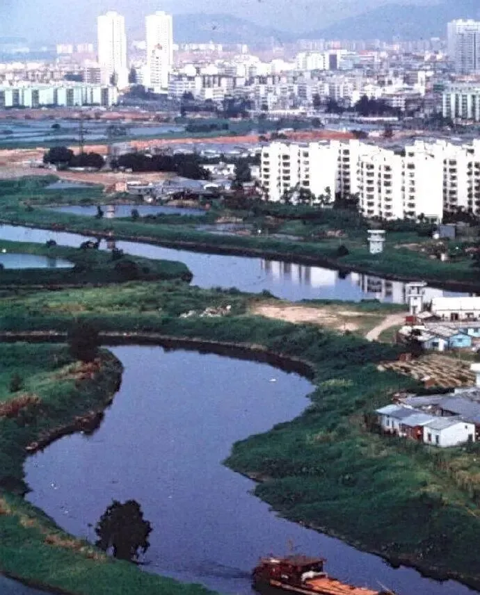 从这张能看出来,那时深圳城外还有大片绿地和鱼塘,水湾弯弯曲曲,岸上草长得旺,村里住着渔民种田人,远处冒起的高楼正慢慢往这边挤过来,城外和城里只隔着一条马路,变化一步步发生,快到让人反应不过来。