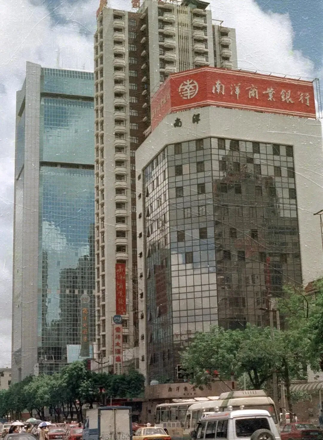 图中这一溜高楼,最抢眼的还是海王大厦,那白色外墙,竖条窗格排列得倍儿整齐,楼顶一圈圆帽子样的顶,看着像外国大片里才会有的大写字母楼,门口广告牌红底白字,大招牌底下密密麻麻小字写着吃喝玩乐,咖啡厅、夜总会、桑拿,那时候这几样加一起,就是新潮范儿的象征。
