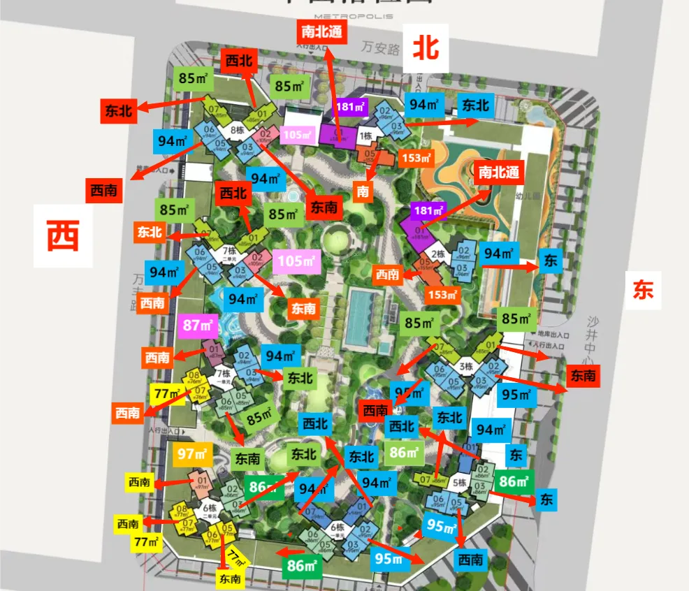 ①户型分析:有横厅和竖厅两种户型,全屋7个飘窗、13米采光面,非常通透;预留超多收纳空间主卧双面采光,景观视野更开阔②朝向:东北、西北朝向③视野:社区花园和社区楼栋