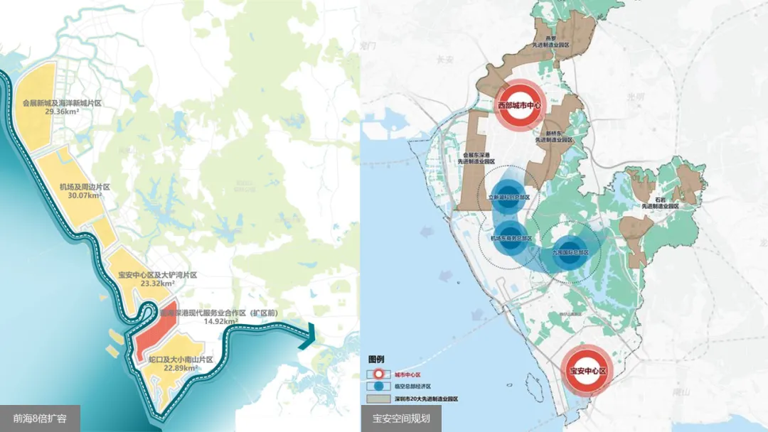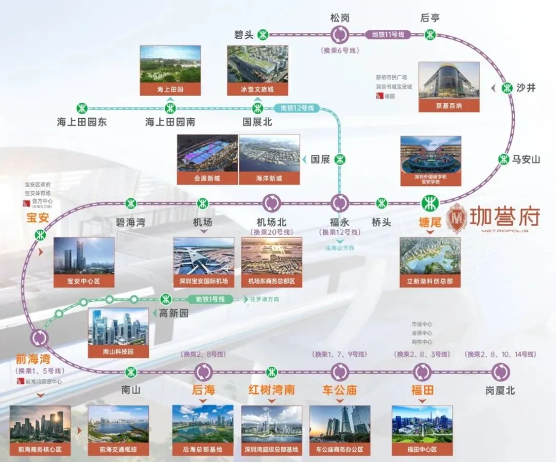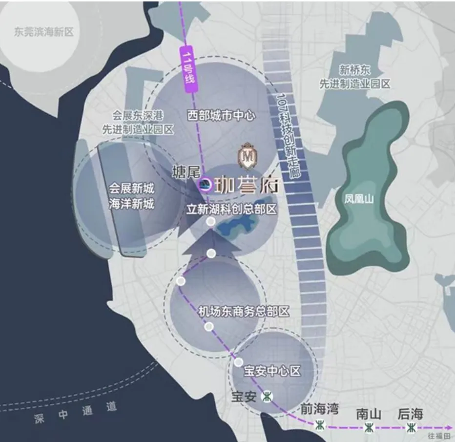 深圳向西发展:沿罗湖-福田-南山-前海及宝安的发展脉搏,2021年前海8倍扩容,深圳向西势不可挡。三重国家战略:前海一级辐射区、会展海洋城、空港新城三重国家级战略叠加,“黄金内湾”崛起。