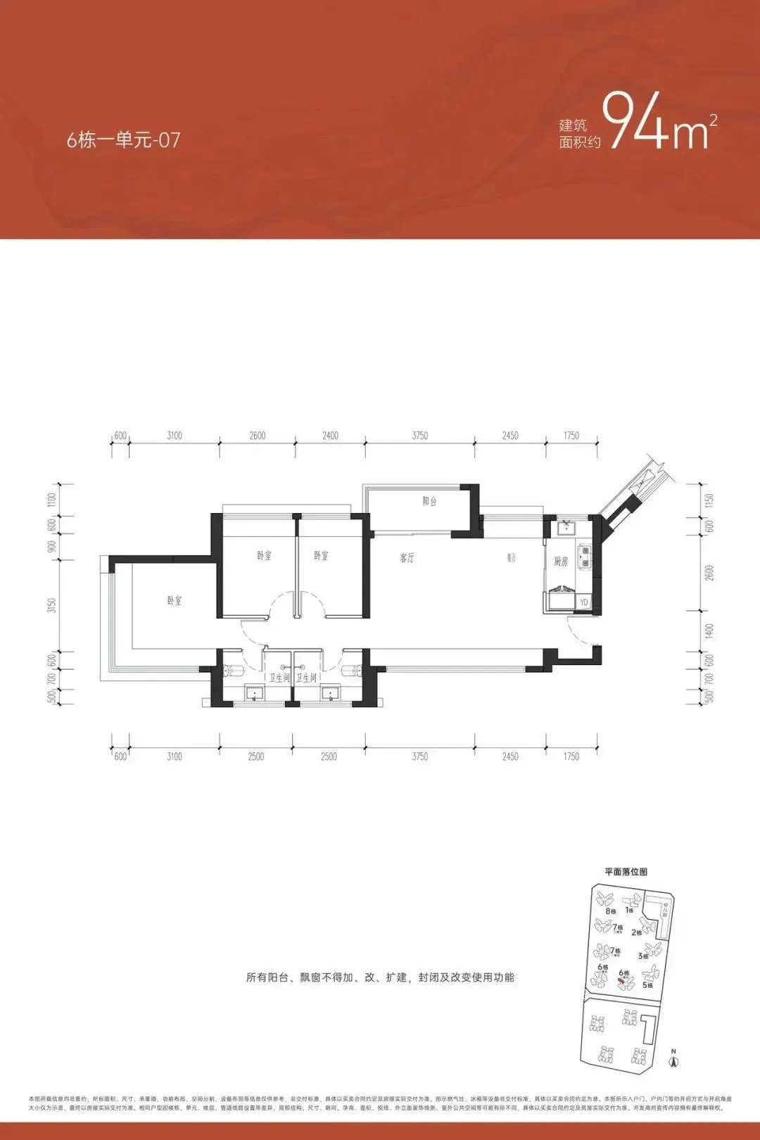 【约94㎡三房两卫户型分布:每一栋都有分布,也是主力户型,共1015套