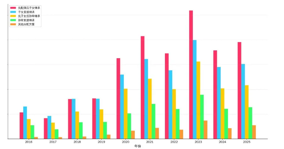 家庭结构多元化推动传承需求升级。在继承人分配方式上,十年前,遗嘱继承的主流是“子女直接继承”。如今,“先配偶后子女继承”占比持续走高,“其他分配方案”(如留给兄弟姐妹、亲密朋友,或捐给公益机构)也快速上升。