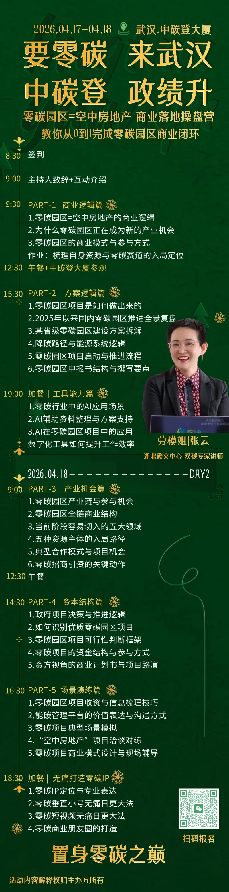 两天,六个模块,从商业逻辑到资本结构,从方案拆解到场景实战,最后还有一场:怎么打造你自己的零碳IP,让客户主动来找你。