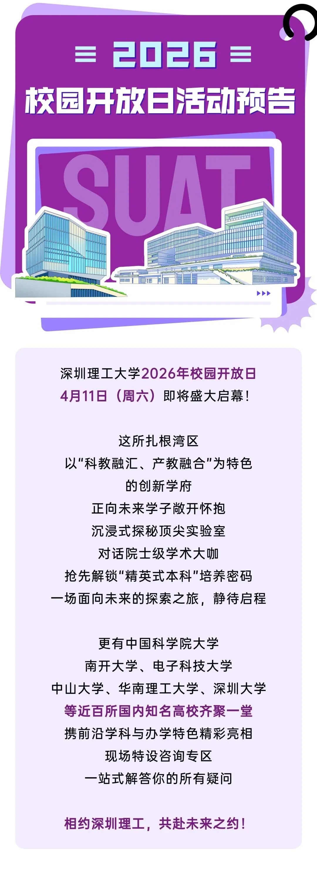 预约入口:扫描或长按识别下方二维码,关注【深圳近期活动展览】公众号,点击发私信,发送“理工大”即可获取深圳理工大学校园开放日预约入口