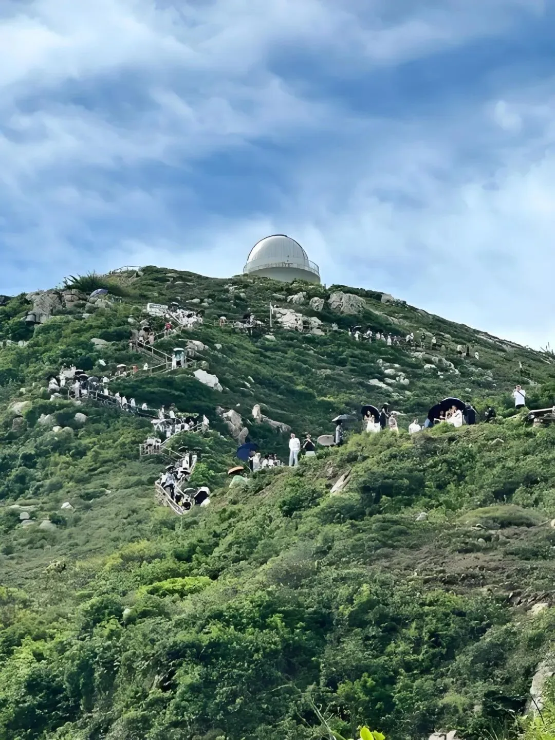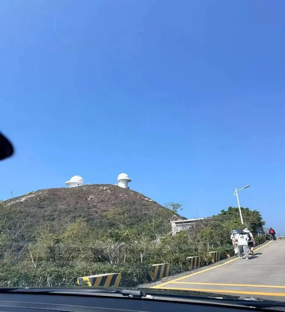 车辆驶入天文台山顶平台,一种“一览众山小”的开阔之感迎面而来。而另一面的大海铺展至天际,孩子们迫不及待地跑向面海的一侧,看着一望无际的大海,发出啧啧惊叹。海天相接,蔚蓝无边,仿佛置身太平洋中央。望着无限延展的海平线,大家深切感受到——地球,原来真的是一颗蓝色的圆圆球体。我们纷纷举起手机,定格下这壮丽而震撼的瞬间。