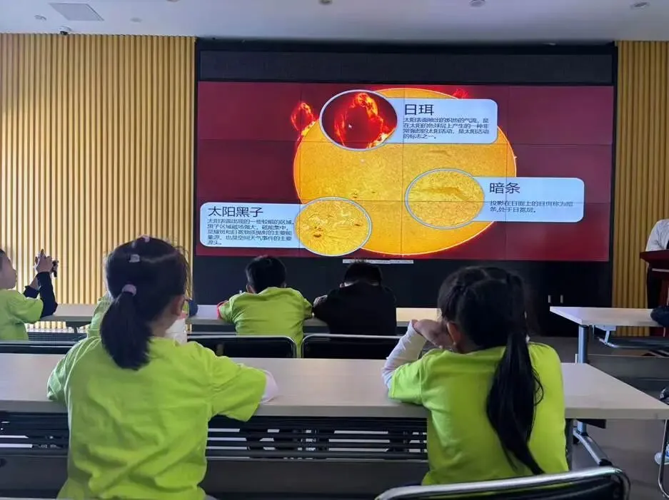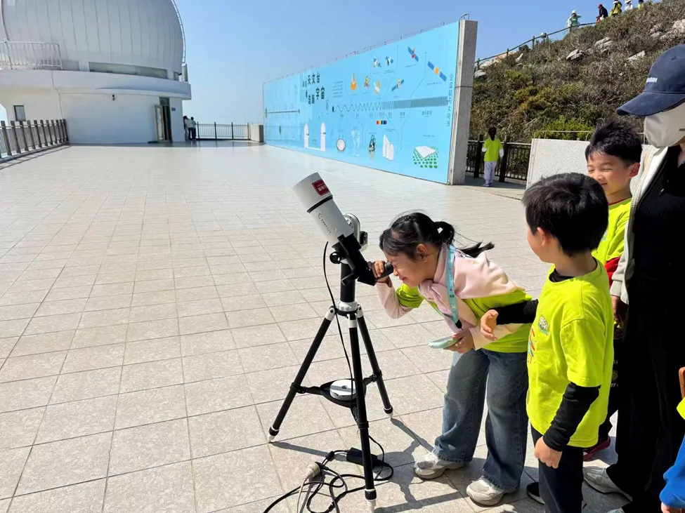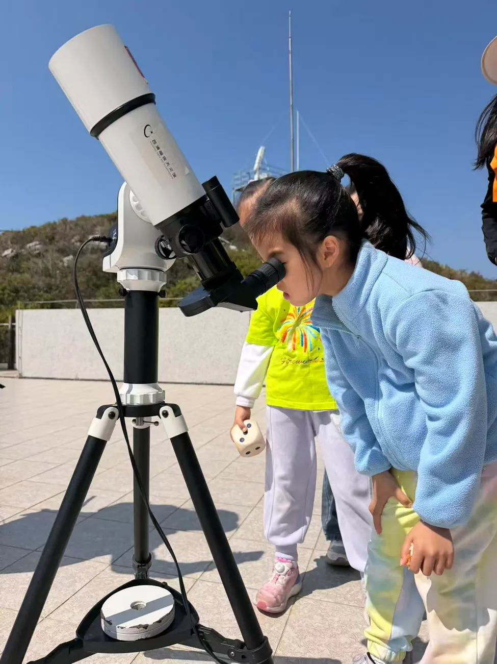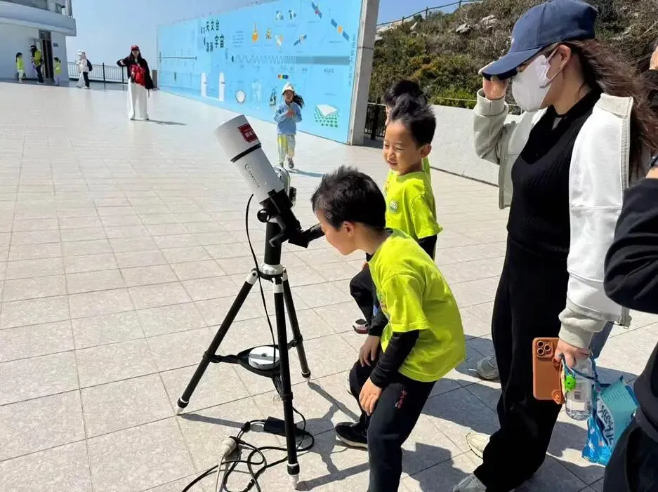 在太阳望远镜室外的平台上,还摆放着一台供参观者使用的小型望远镜。工作人员耐心地向孩子们讲解,这台望远镜可以直接观察到太阳的一部分以及太阳黑子。在工作人员的引导下,孩子们自觉排队,井然有序地轮流观测。当透过镜头看到太阳表面那一颗小小的黑斑时,惊喜和兴奋写在了每一张笑脸上。抽象的天文知识,在这一刻变得直观而真实。