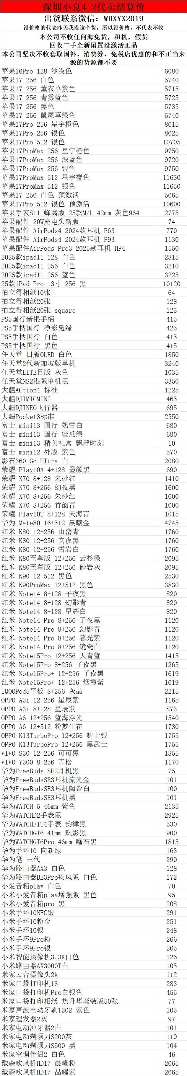>深圳小良2026.4.2电子产品代卖结算价(美妆价格小程序查看)