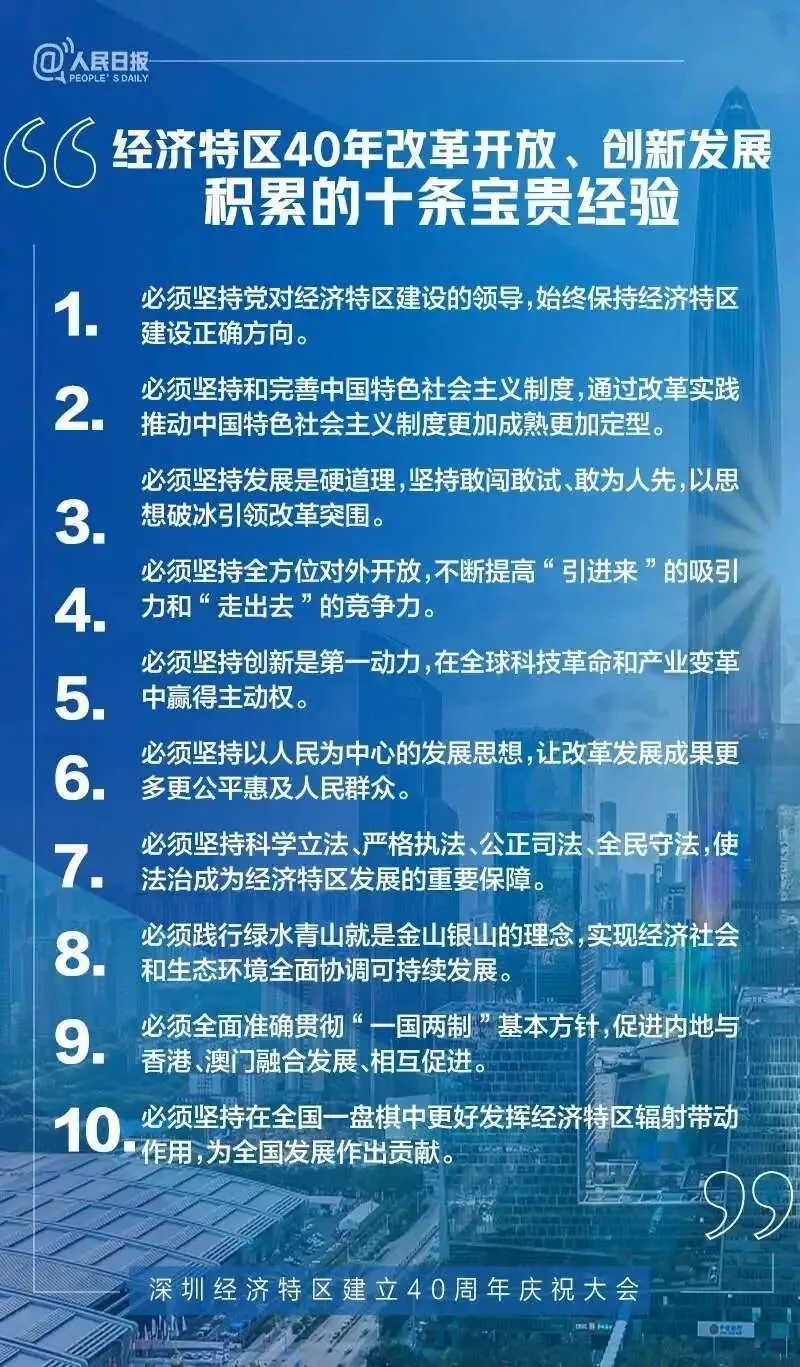 以下十条,是经济特区40年改革开放、创新发展积累的宝贵经验,对新时代经济特区建设具有重要指导意义,必须倍加珍惜、长期坚持,在实践中不断丰富和发展。