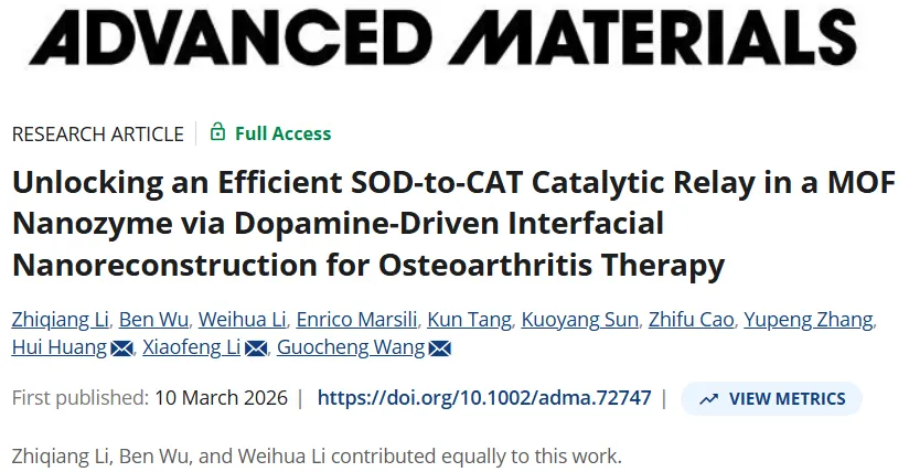 骨关节炎(OA)由炎症与活性氧(ROS)构成的恶性循环驱动。钴基金属有机框架(MOF)纳米酶是高效的过氧化氢酶(CAT)模拟物,但其类超氧化物歧化酶(SOD)活性较弱,无法实现全程ROS清除,严重制约了其治疗效果。2026年3月10日,中国科学院深圳先进技术研究院王国成、南昌大学李晓峰、中山大学黄辉共同通讯在Advanced Materials 在线发表题为“Unlocking an Efficient SOD-to-CAT Catalytic Relay in a MOF Nanozyme via Dopamine-Driven Interfacial Nanoreconstruction for Osteoarthritis Therapy”的研究论文。该研究通过“预嵌入/激活”策略解决了这一催化活性失衡问题。首先将Zn²预嵌入钴基框架中,构建稳定且可激活的前体;随后通过多巴胺(DA)介导的“激活”过程,重构潜在的Zn/Co-N配位位点,通过协同增强类SOD活性,实现高效的SOD-to-CAT催化,无缝衔接整个ROS级联反应。这种强大的ROS清除能力可恢复线粒体功能,并通过抑制ROS介导的S100A8/NF-κB信号轴及其破坏性正反馈循环,将巨噬细胞重编程为抗炎M2表型。这种免疫调节作用在大鼠OA模型中体现出显著的治疗效果:该纳米酶可同时促进软骨细胞合成代谢,实现明显的软骨修复,同时抑制周围神经敏化,提供持久的镇痛效果。综上,该研究表明纳米级界面重构作为一种高效、合理的平台,可用于在纳米酶内部构建精密的催化系统,为先进生物医学应用提供了新思路。骨关节炎(OA)是全球最常见的退行性关节疾病,其特征为进行性软骨破坏、滑膜炎症和软骨下骨重塑,最终导致关节功能丧失和难治性疼痛。近年来研究表明,滑膜炎症微环境是驱动OA病理进程的核心枢纽。在该枢纽中,巨噬细胞异常极化(主要向促炎M1表型极化)与活性氧(ROS)爆发性蓄积之间形成双向正反馈循环,构建起自我放大的病理网络。M1巨噬细胞会大量产生ROS,并释放白细胞介素-1β(IL-1β)、肿瘤坏死因子-α(TNF-α)等关键炎症细胞因子。这些细胞因子激活NF-κB信号通路,直接促进软骨细胞和滑膜成纤维细胞中基质金属蛋白酶和聚集蛋白聚糖酶的过表达,进而介导软骨基质的不可逆降解。更关键的是,组织降解产物和新形成的损伤相关分子模式(DAMPs)会被巨噬细胞识别,进一步驱动其向M1表型极化,并持续释放ROS和炎症介质。这一循环过程不仅加剧软骨结构损伤,还通过伤害感受器敏化和炎症环境的持续存在导致持续性疼痛。目前OA的临床管理主要依赖非甾体抗炎药(NSAIDs)以及关节内注射皮质类固醇或透明质酸,虽能提供短期症状缓解,但无法逆转软骨结构损伤,也不能打破“炎症-氧化”这一核心恶性循环。此外,长期使用还会带来显著的不良反应。对于晚期患者,关节置换手术仍是最终选择,但该手术具有侵入性、成本高且存在自身并发症风险等问题。因此,开发能够从根源上打破这一循环的新型治疗方法,对于OA的有效治疗至关重要。纳米酶作为一类具有类天然酶活性的人工材料,为干预这一病理循环提供了新机遇。其中,钴基金属有机框架(MOF),沸石咪唑酯骨架-67(ZIFCo),因其具有高密度的催化活性位点,具备优异的类过氧化氢酶(CAT)活性,是极具潜力的候选材料。然而,其固有的化学不稳定性限制了其在复杂生理环境中的应用。更重要的是,这种典型的钴基纳米酶存在一个关键局限,其类超氧化物歧化酶(SOD)活性通常较弱。这种催化失衡使其无法清除ROS级联反应的起始物超氧阴离子(·O2−),无法实现OA中复杂氧化应激环境的全面净化,严重制约了其治疗潜力。图1 ZIFZn/Co@PDA纳米酶的制备及其对骨关节炎的治疗效果示意图(摘自Advanced Materials)为解决钴基纳米酶类SOD活性不足这一关键局限性,研究人员尝试了多种策略,如掺杂其他金属离子(如铅、铜)或构建异质结构、调控配位环境或电子结构以及表面修饰等,旨在提升其·O2−清除能力。然而,这些方法往往存在活性提升有限、制备过程复杂、生物相容性差或无法在维持高类CAT活性的同时协同增强类SOD活性等局限性。因此,迫切需要开发一种用于双功能纳米酶设计和精准调控的新策略,尤其是具有高类SOD活性的纳米酶。本研究提出一种新型“预嵌入/激活”纳米界面工程策略,构建了一种具有高效双类SOD和CAT活性的分级核壳结构纳米酶ZIFZn/Co@PDA。该策略首先将Zn/Co-N位点“预嵌入”ZIF框架中,随后通过多巴胺(DA)介导的“激活”步骤,将这些位点重构为更优异的Co-N/O构型,协同增强两种催化功能。锌离子的稳定作用以及其部分逃逸过程中产生的空位带来的电子优化,进一步促进了这种催化活性的增强。功能上,ZIFZn/Co@PDA能够完全清除ROS,从而下调S100A8的表达,抑制NF-κB信号通路的激活,并逆转巨噬细胞的促炎极化。因此,这种免疫微环境的重编程不仅通过改善软骨细胞稳态提供软骨保护,还能抑制周围神经敏化。结果表明,ZIFZn/Co@PDA作为一种疾病修饰治疗策略,在OA治疗中具有显著潜力。https://advanced.onlinelibrary.wiley.com/doi/10.1002/adma.72747