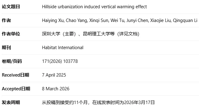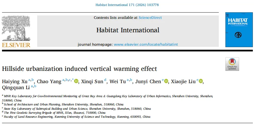 Xu, H., Yang, C., Sun, X., Tu, W., Chen, J., Liu, X., & Li, Q. (2026). Hillside urbanization induced vertical warming effect. Habitat International, 171, 103778.