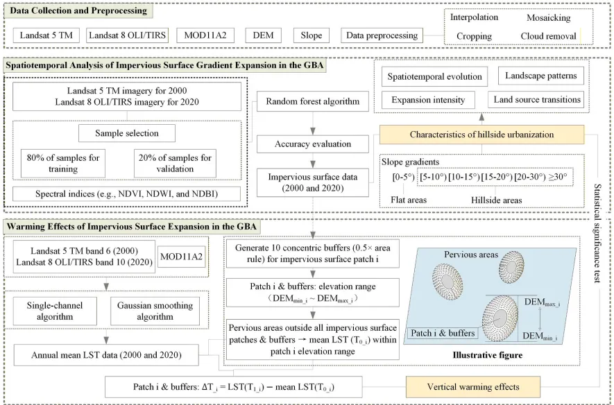 研究区域为粤港澳大湾区(GBA),涵盖11个城市,地形异质性强(北部多山、南部为平原)。数据包括Landsat遥感影像(2000和2020年)、MODIS地表温度(LST)数据和SRTM数字高程模型(DEM),空间分辨率统一为30米。方法框架包括: