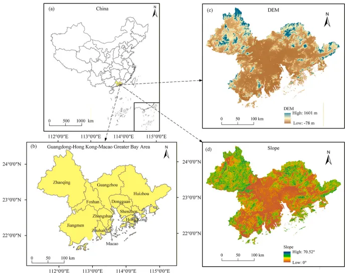 研究区域图(图2)突出GBA的地形异质性,为山坡城市化提供空间背景。
