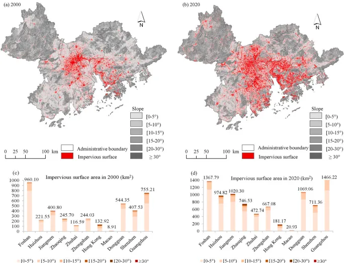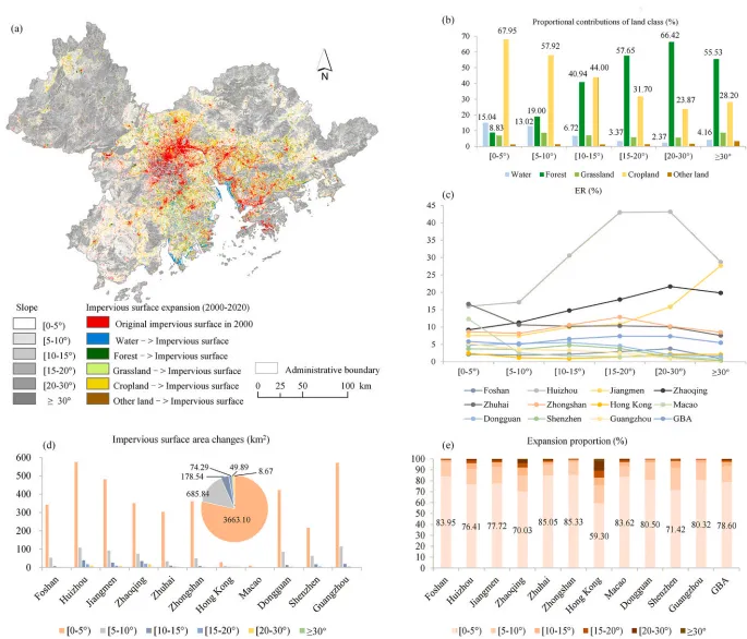 GBA山坡城市化显著,2000-2020年贡献了21.40%的不透水表面扩张,主要侵占森林和耕地。