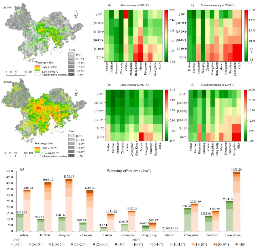 研究以粤港澳大湾区(GBA)为案例,利用多源遥感数据(如Landsat和MODIS),系统分析了2000-2020年间山坡城市化(坡度≥5°的区域)的时空演变特征及其导致的垂直增温效应。论文的核心在于揭示城市化从平原向山坡延伸的过程中,如何通过改变地表景观格局(如不透水表面的面积、聚集度),加剧区域热应力,并首次量化了这种“垂直增温效应”(即沿山坡梯度温度升高的现象)。研究发现,GBA山坡城市化面积占不透水表面总扩张的21.40%,导致平均增温强度从1.42°C升至1.64°C,增温影响面积扩大约206%,且增温效应与不透水表面的景观指数(如斑块数量、形状复杂度)显著正相关。这一研究的意义在于为山坡开发政策提供了定量依据,警示无序山坡城市化可能加剧生态脆弱性,并为区域热环境减缓策略(如优化绿地布局)提供了理论支撑,对全球类似山地城市的可持续发展具有警示和借鉴作用。