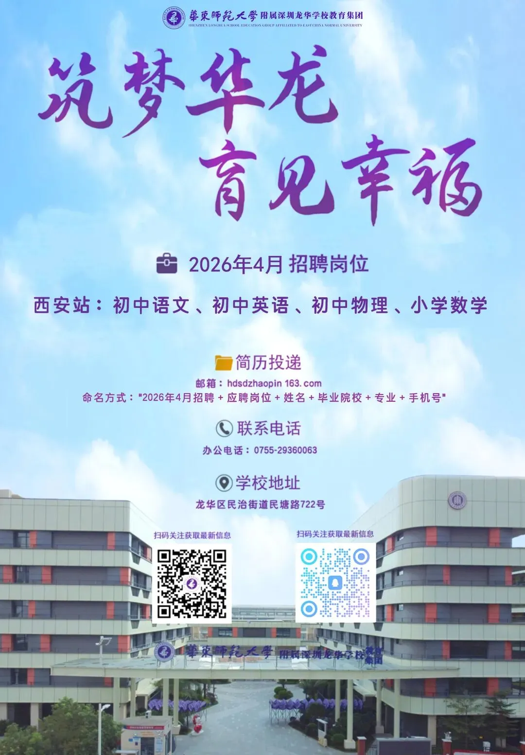为满足学校发展及教学需要,华东师范大学附属深圳龙华学校教育集团定于2026年4月面向应届毕业生公开招聘教师岗位4个。现就有关事项公告如下: