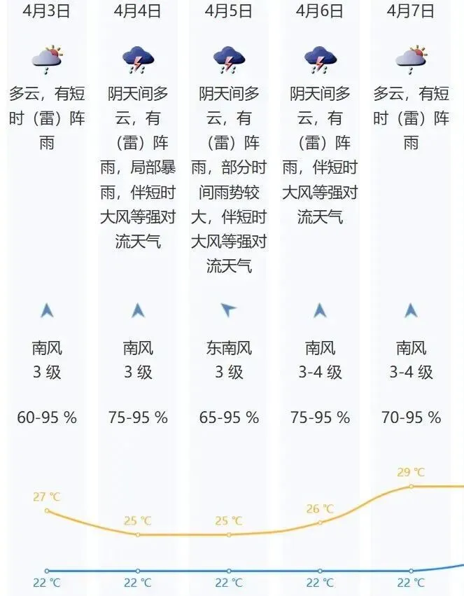 预计3日多云,有短时雷阵雨,气温22-27℃。