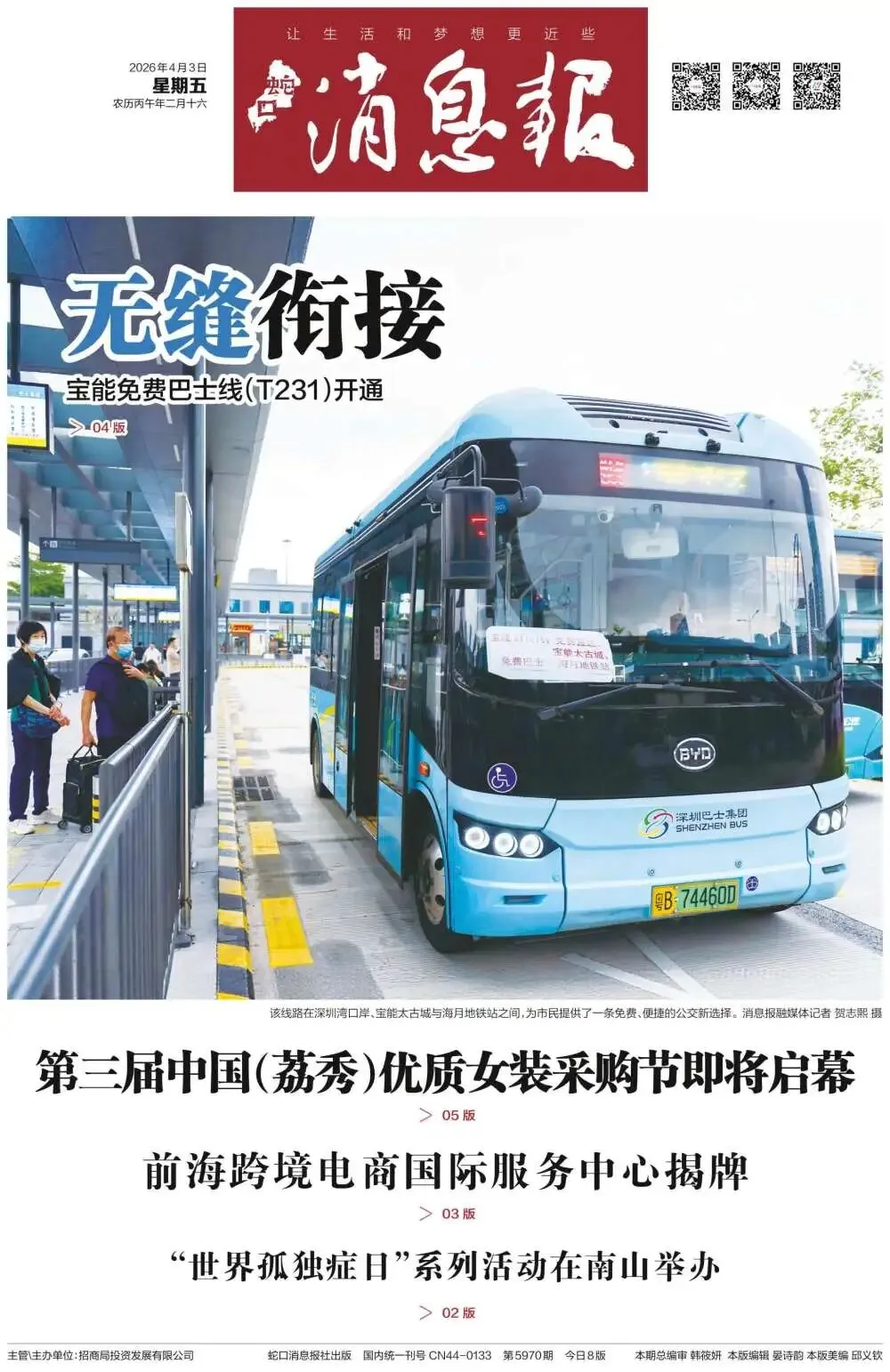 为有效解决短途接驳与商圈出行的民生痛点,进一步优化南山区公共交通服务,4月1日,宝能免费巴士线(T231)正式开通。该线路在深圳湾口岸、宝能太古城与海月地铁站之间,为市民提供了一条免费、便捷的公交新选择。详情>>>