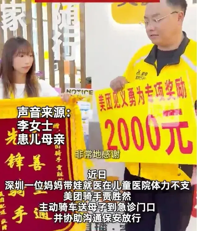 前日,家人们,看到一条深圳的热点视频,看完后整个人眼眶都红了,忍不住要跟大伙唠唠,就在3月22号上午10点30分,深圳红荔路街头,一位叫李女士的妈妈抱着孩子,慌里慌张地在路边求助,怀里的孩子全身抽搐,状况十分危急,李女士体力不够,急得快要哭出来,连站都有点儿站不稳。那时候正好是外卖午高峰的关键时候,来来往往的车辆飞快地驶过,有人停下脚步问情况,但是没人能马上给出帮助。我隔着屏幕都跟着心里难受,心里一直在想,孩子可千万别出事,一定要有人来帮忙就在这时,美团外卖小哥贾胜然骑着电动车经过,看到这一幕,想都没想就猛地停下车,一路小跑冲了过去——这一幕,很快刷屏了深圳人的朋友圈。我后来翻来覆去看了网友的实拍视频还有媒体报道,才一点点拼凑出完整的经过,这位外卖小哥叫贾胜然,老家有个8岁的女儿,当时他正赶着配送午高峰的订单,看到李女士的求助,瞬间共情,没有丝毫犹豫就停了车,甚至没顾上关掉车后座的外卖箱。他先小心翼翼地扶李女士和孩子坐上自己的电动车,又叮嘱李女士抱紧孩子,自己则跨上电动车,一路闯红灯、抄近路,拼尽全力往儿童医院赶。到了医院后,贾胜然又帮忙抱着孩子冲进急诊室,直到看着孩子被医生接手,才松了口气。李女士握着他的手,一个劲儿说谢谢,还想给他塞红包表达谢意,却被小哥笑着拒绝了,“姐,不用客气,我也是当爸爸的,知道你着急,孩子没事就好。小哥回答挺朴实的,“上班能晚点,订单能超时,但是孩子的病可不能等,要是出点事儿,一辈子都不得安心,。更让人感动的是,贾胜然安顿好母女俩后,才匆匆骑上电动车赶去配送剩下的订单,还主动给商家和顾客说明情况。让人觉得暖心的是,商家和顾客知道真相之后,不但没有投诉他,还都纷纷给他留言道歉、送上祝福,后来李女士特意全城寻人,找到贾胜然后,当面送上了锦旗。美团平台也授予他“先锋骑手”称号,给予表彰奖励,就这样,一个普通外卖小哥弃单救娃的善举,慢慢发酵成了全网热议的热点,评论区里满是“这才是我们该追的星”“平凡的人,做着最不平凡的事”。其实我们身边,从来都不缺这样的正能量。没有惊天动地的壮举,没有轰轰烈烈的誓言,只是普通人在关键时刻,凭着心底的善良和共情,选择伸出援手,用一点点善意,温暖着身边的人。贾胜然只是千万外卖小哥中的一个,他没有想过要出名,也没有想过要得到什么回报,只是凭着“同为父母”的共情,做了一件自己认为该做的事。反观现在有些热点,充斥着炒作和流量,而这样的好人好事,才是我们真正应该传播的内容。善良从来都不是一种选择,而是一种本能,它不分职业、不分身份,不分贫富。希望咱们都能像贾胜然那样,守住心里的温柔和共情,在别人需要的时候,大胆地伸出援手,微光汇聚,便成星河,愿每一份善意,都能被看见、被珍惜,愿这个世界,因为我们每个人的一点点努力,变得更加温暖。