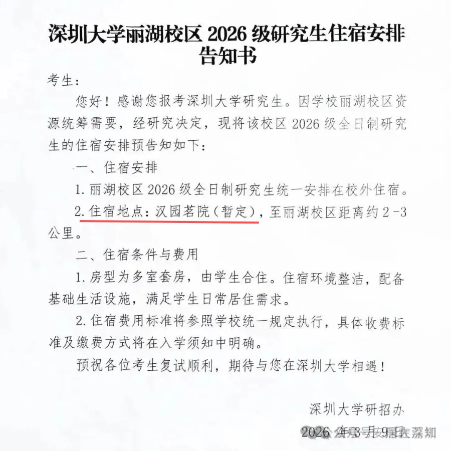 在房产圈和考研圈同时投下了重磅炸弹:2026级研究生将统一安排在校外居住,暂定地点正是位于南山西丽的汉园茗院。