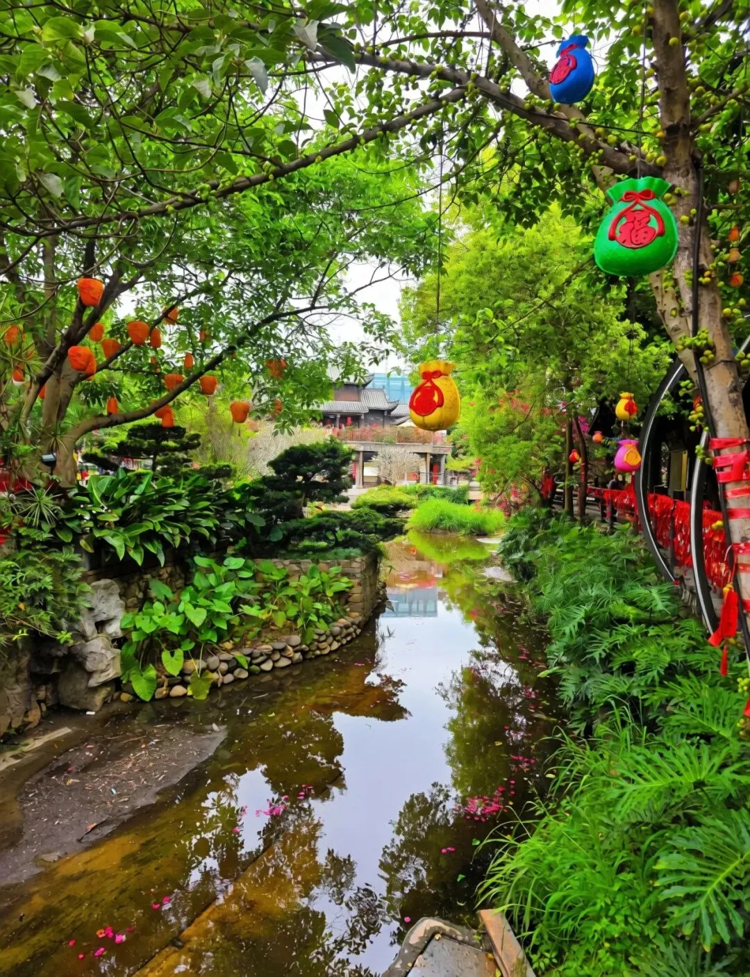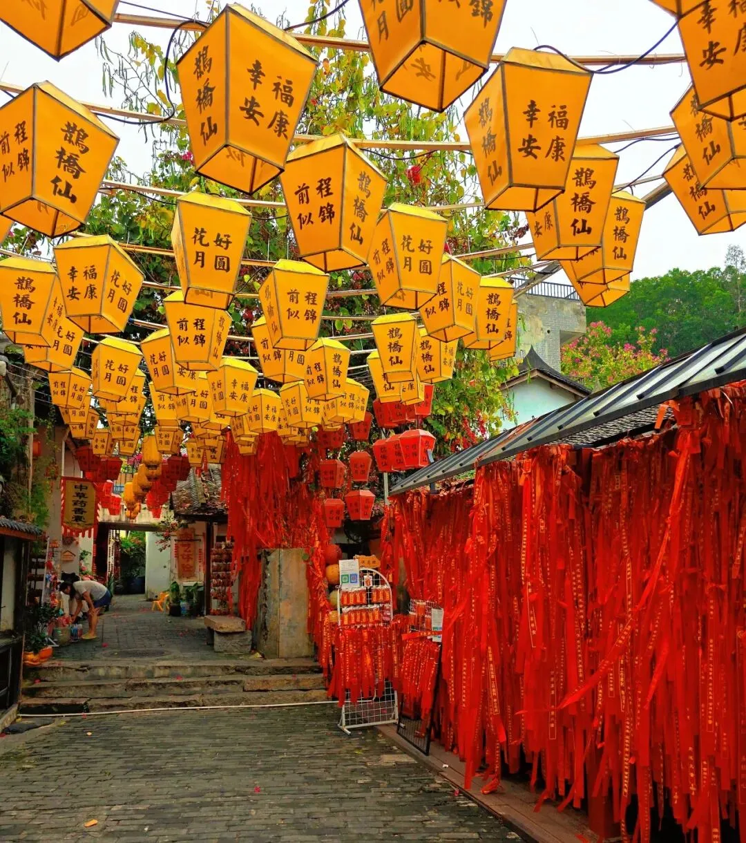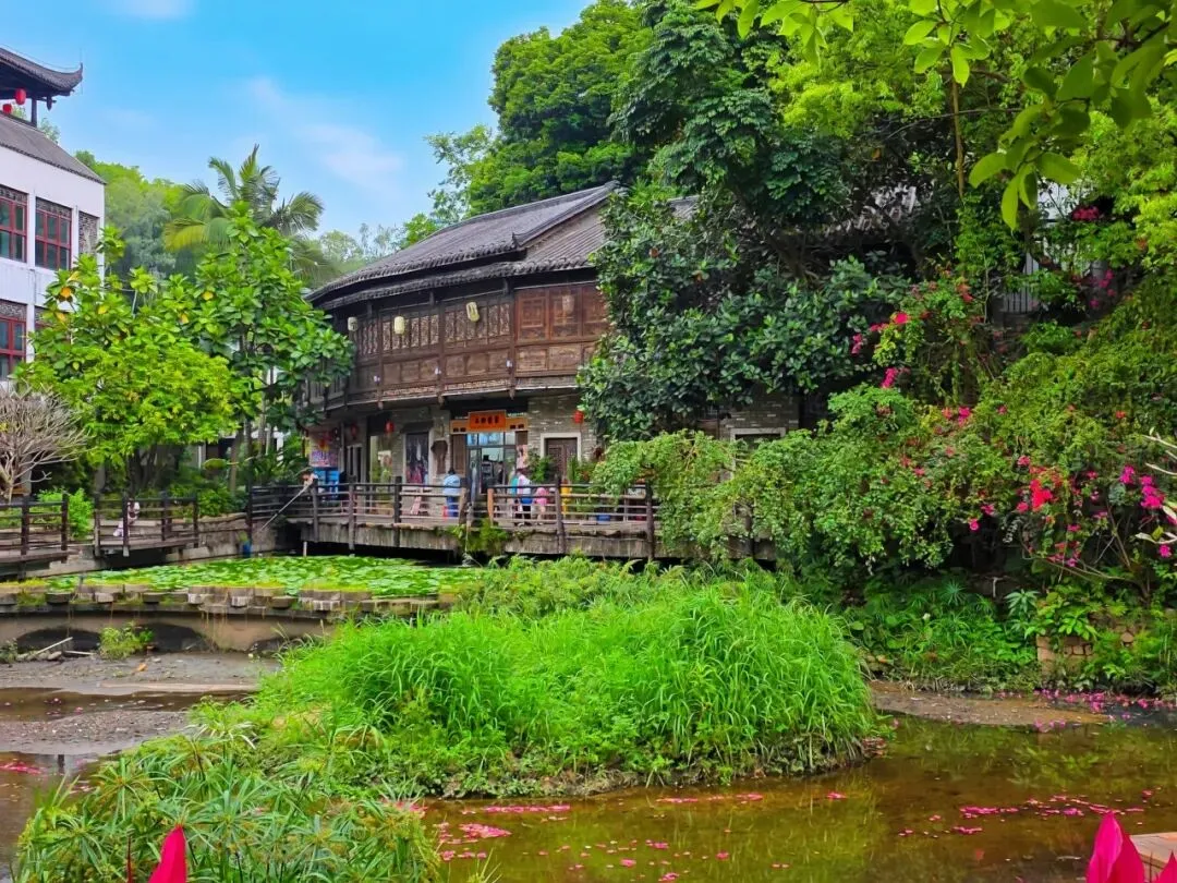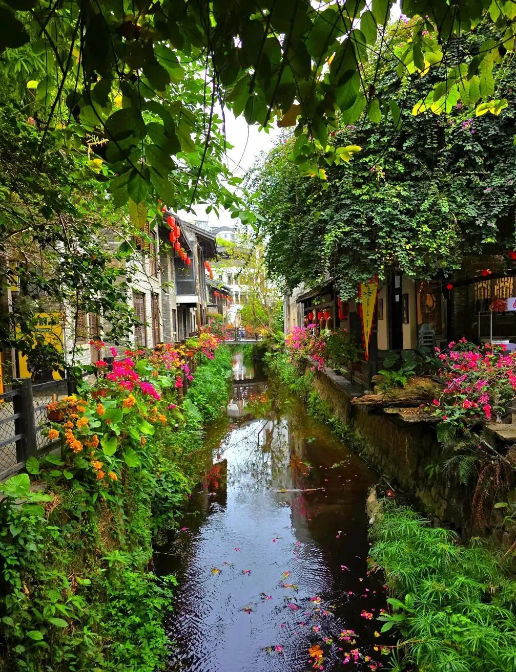 甘坑的美,藏在每一条小巷、每一处流水里。沿着溪流漫步,两岸的三角梅热烈绽放,红的、橙的、粉的花朵爬满墙头,与青砖老屋相映成趣。红灯笼沿着屋檐一路延伸,溪水倒映着两岸的景致,落花随波逐流,微风送来花香。在这里,没有都市的喧嚣,只有古村的宁静与诗意,让人忍不住放慢脚步,沉醉在这一方山水之间。