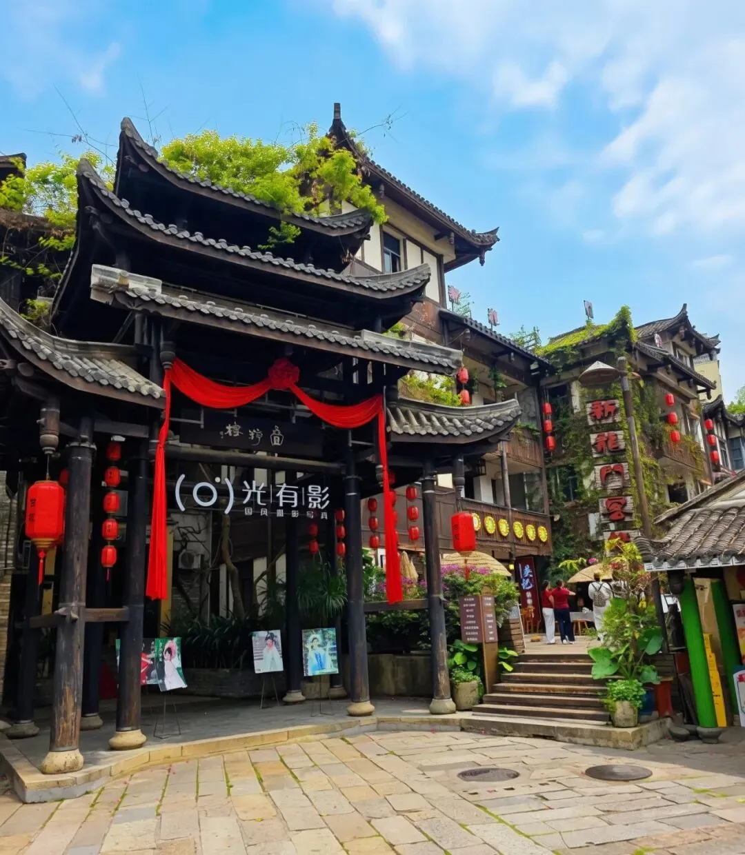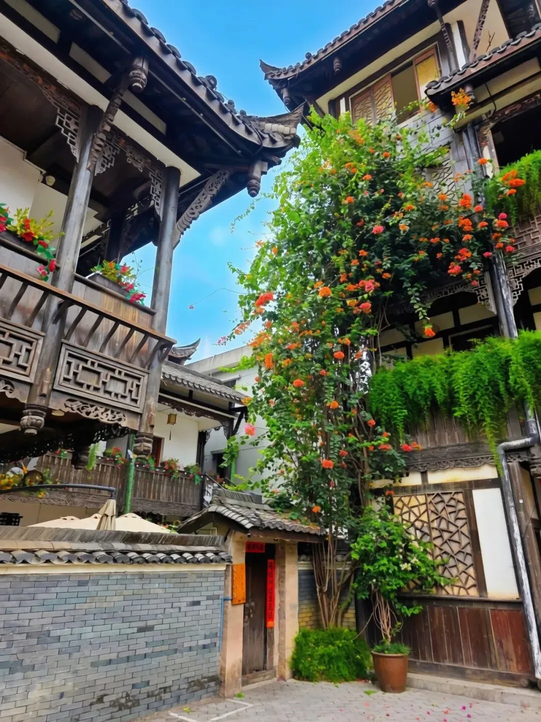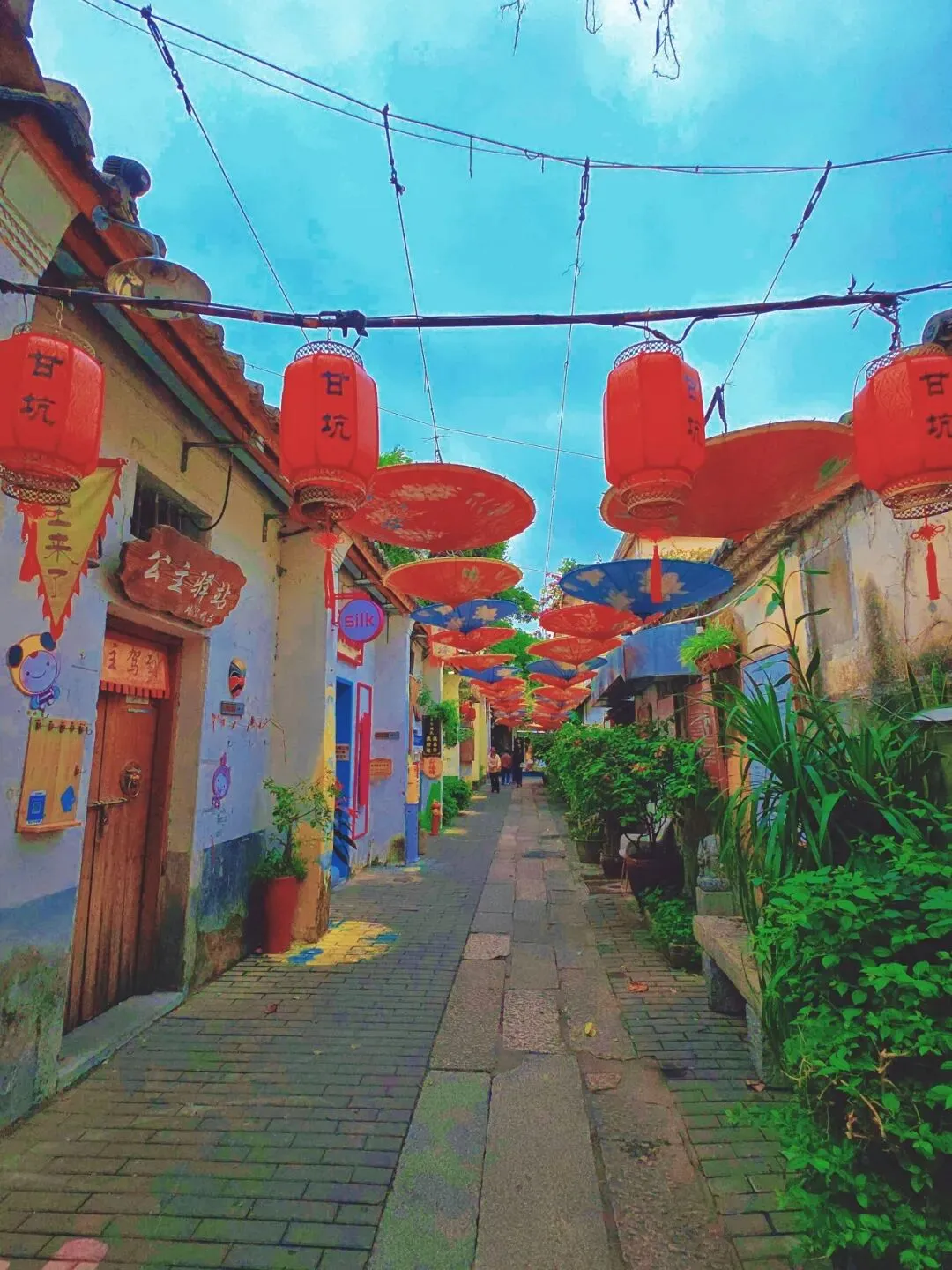 甘坑的美,藏在每一条小巷、每一处流水里。沿着溪流漫步,两岸的三角梅热烈绽放,红的、橙的、粉的花朵爬满墙头,与青砖老屋相映成趣。红灯笼沿着屋檐一路延伸,溪水倒映着两岸的景致,落花随波逐流,微风送来花香。在这里,没有都市的喧嚣,只有古村的宁静与诗意,让人忍不住放慢脚步,沉醉在这一方山水之间。