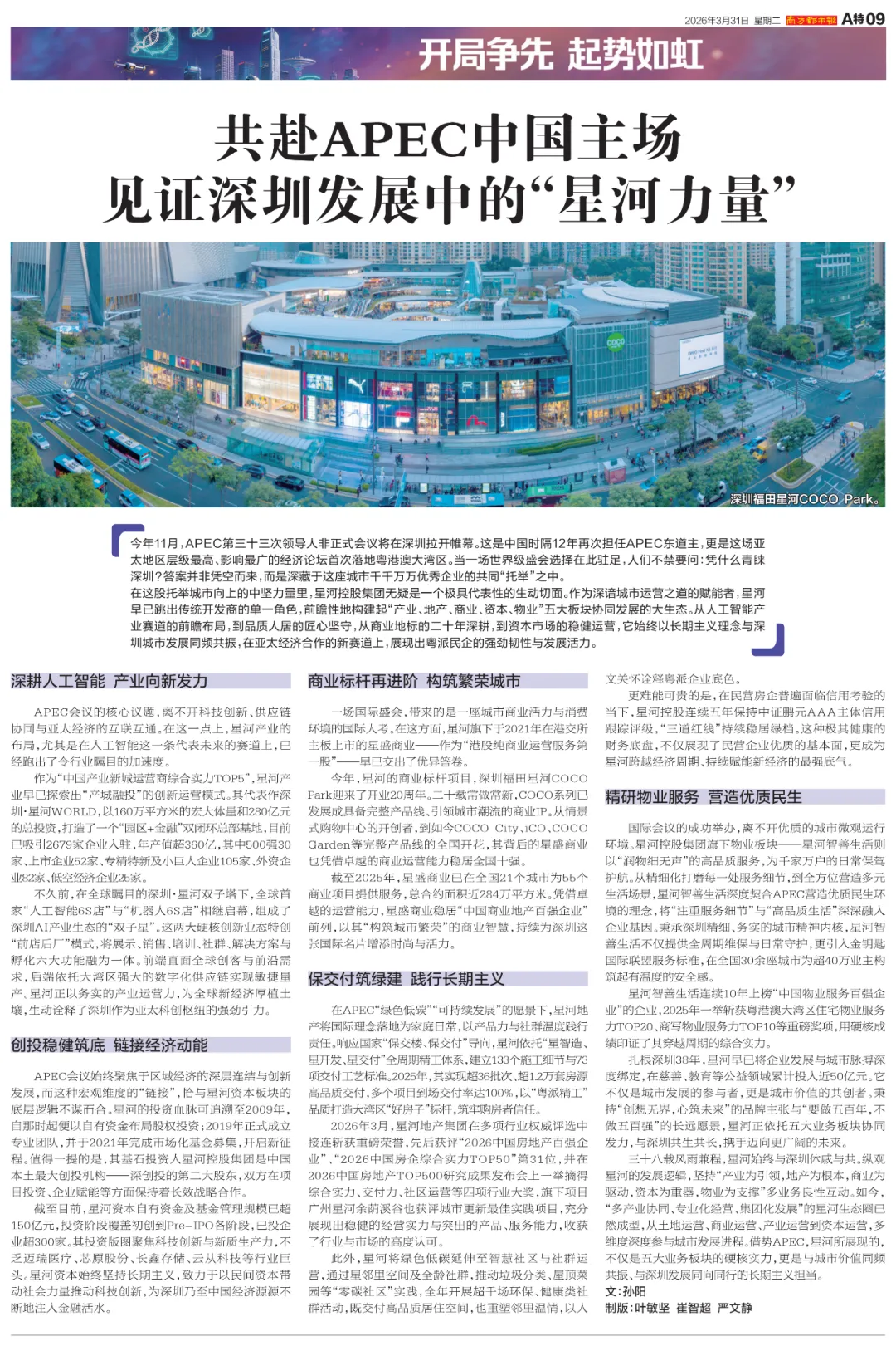 在这股托举城市向上的中坚力量里,星河控股集团无疑是一个极具代表性的生动切面。作为深谙城市运营之道的赋能者,星河早已跳出传统开发商的单一角色,前瞻性地构建起“产业、地产、商业、资本、物业”五大板块协同发展的大生态。从人工智能产业赛道的前瞻布局,到品质人居的匠心坚守,从商业地标的二十年深耕,到资本市场的稳健运营,它始终以长期主义理念与深圳城市发展同频共振,在亚太经济合作的新赛道上,展现出粤派民企的强劲韧性与发展活力。