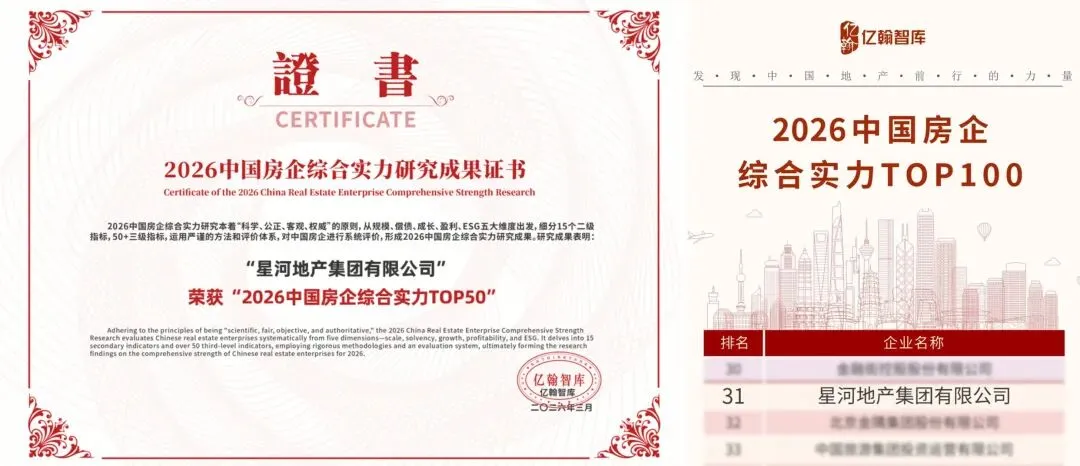 2026年3月,星河地产集团在多项行业权威评选中接连斩获重磅荣誉,先后获评“2026中国房地产百强企业”、“2026中国房企综合实力TOP50”第31位,并在2026中国房地产TOP500研究成果发布会上一举摘得综合实力、交付力、社区运营等四项行业大奖,旗下项目广州星河余荫溪谷也获评城市更新最佳实践项目,充分展现出稳健的经营实力与突出的产品、服务能力,收获了行业与市场的高度认可。