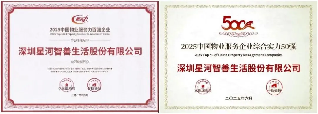 星河智善生活连续10年上榜“中国物业服务百强企业”的企业,2025年一举斩获粤港澳大湾区住宅物业服务力TOP20、商写物业服务力TOP10等重磅奖项,用硬核成绩印证了其穿越周期的综合实力。