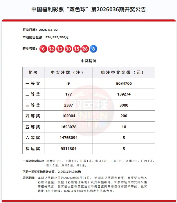 4月3日,中国福彩发布双色球第2026036期中奖情况,本期一等奖共中出9注,分布为:黑龙江1注、上海1注、江苏1注、浙江1注、山东1注、河南1注、广西1注、四川1注、深圳1注,单注中奖金额为5684766元。