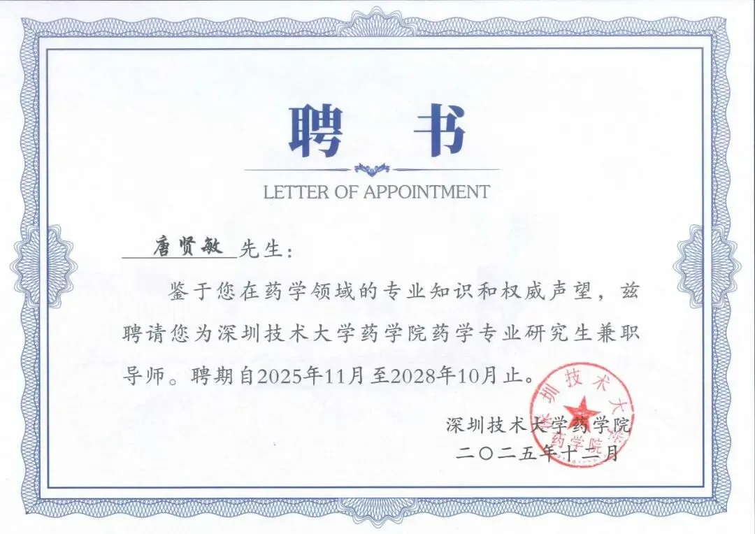 唐贤敏在受聘后表示,深圳技术大学药学院作为大湾区生物医药产业的人才摇篮,其应用型的办学定位与产业发展需求高度契合。未来他将充分发挥其在产业资源与行业视角方面的优势,积极参与学院的人才培养工作,助力学子在药学领域实现更深层次的发展。