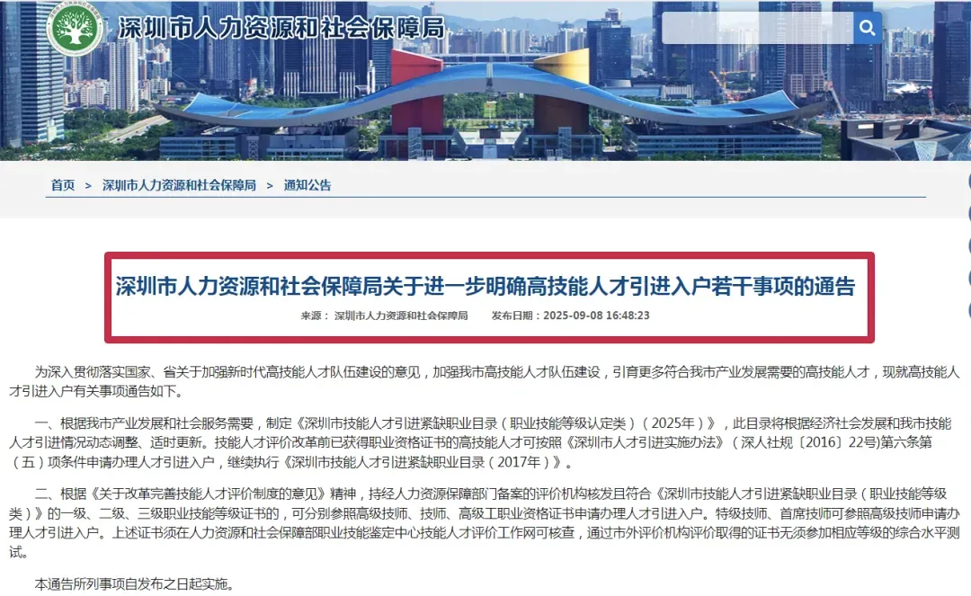 2025年9月,深圳人社局发布了新通告,明确了职业技能等级证书也可以用来入户了!