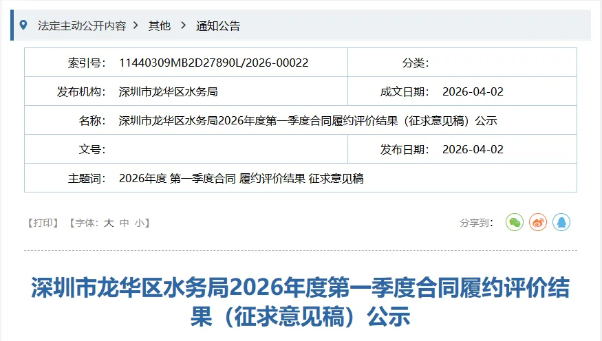 深圳市龙华区水务局2026年度第一季度合同履约评价结果(征求意见稿)公示