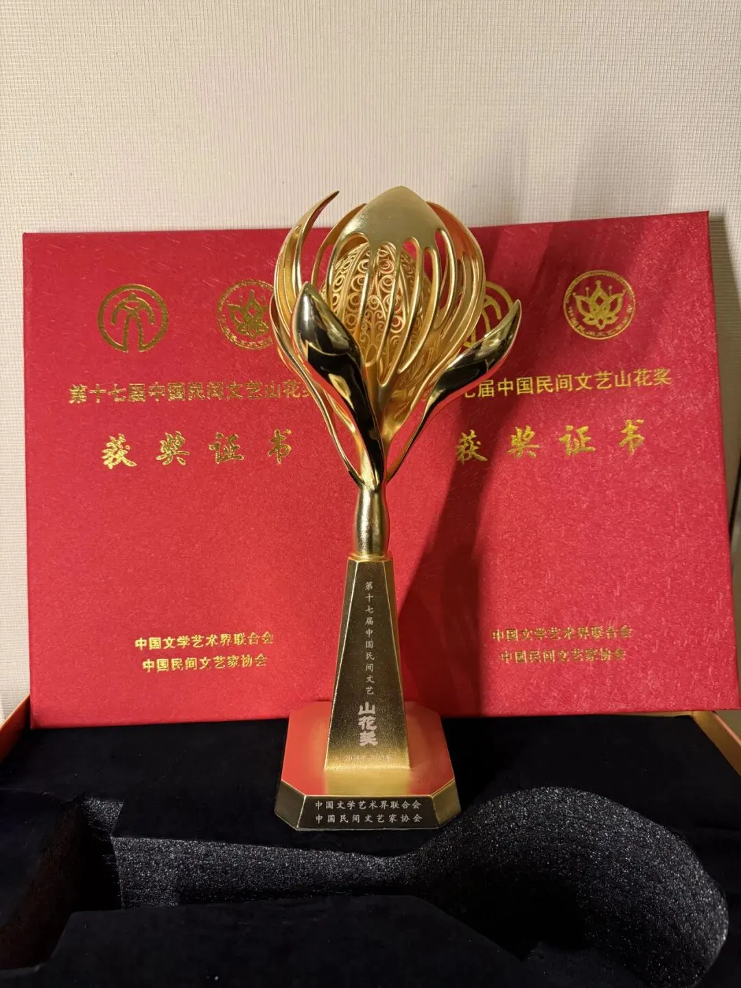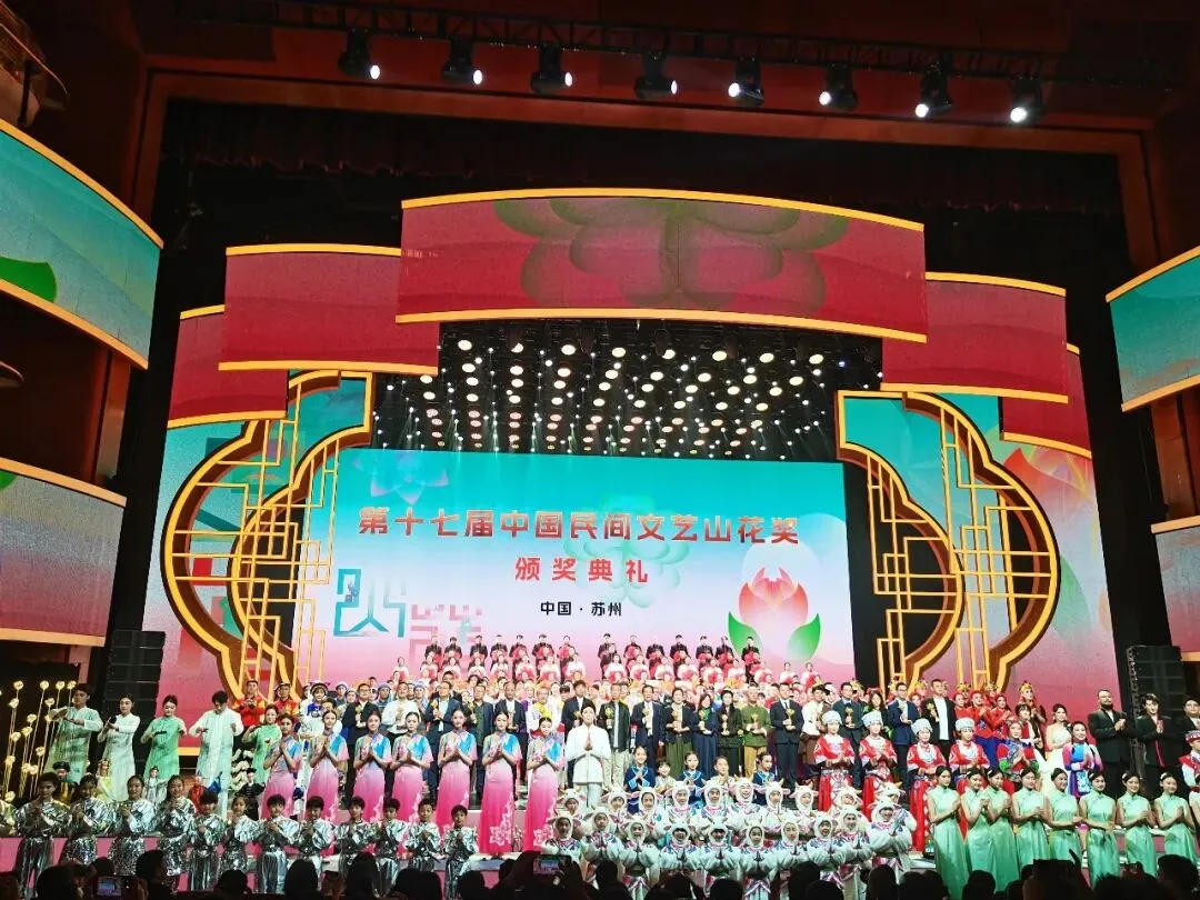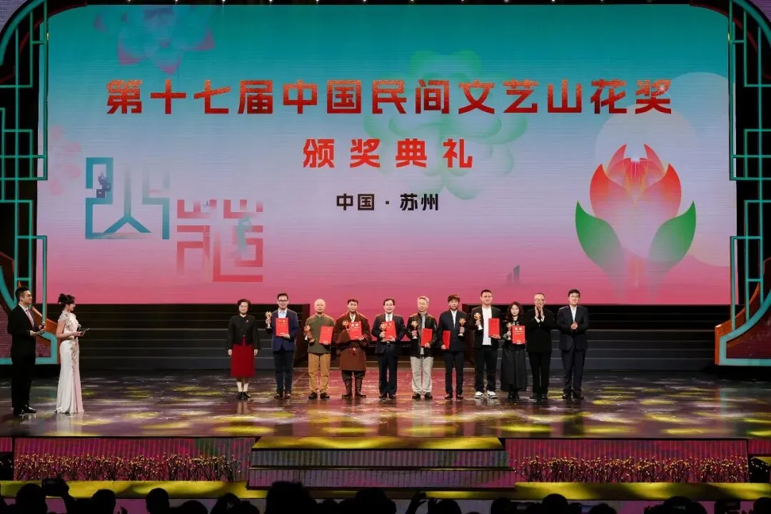 2026年3月30日,第十七届中国民间文艺山花奖颁奖典礼在苏州文化艺术中心大剧院隆重举行。深圳市民间文艺家协会(以下简称“深圳市民协”)选送的珠绣作品《峡谷奇光》荣获“山花奖·优秀民间工艺美术作品”奖,作者黄溢琳、黄伟雄出席颁奖典礼并领奖。