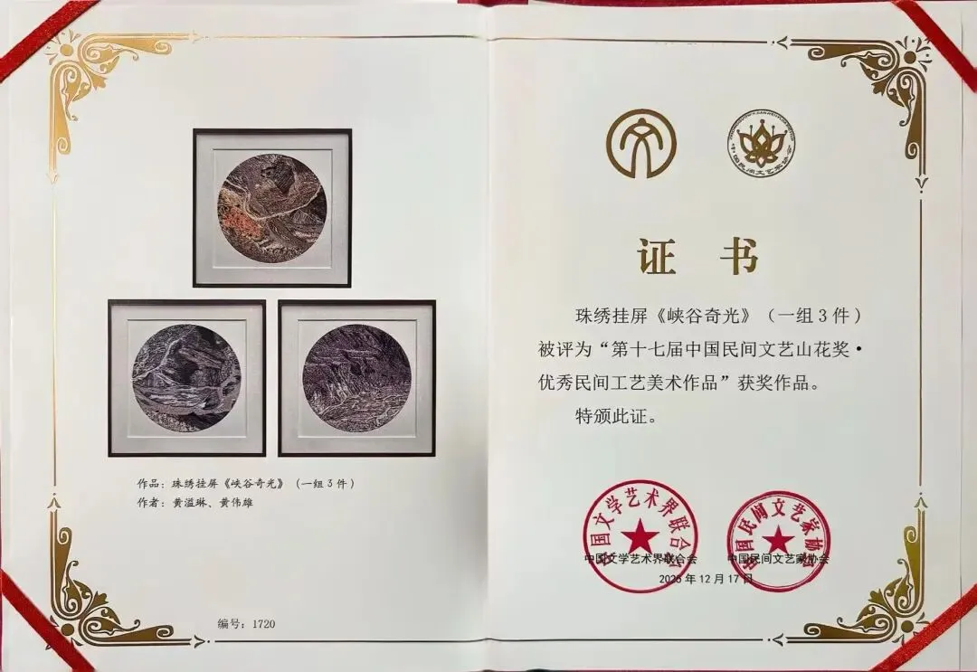 中国民间文艺山花奖是经中宣部批准、由中国文联和中国民间文艺家协会联合主办的全国性民间文艺奖项,是中国文艺界的最高奖项之一,自1999年开始评选,至2025年已举办17届,现设优秀民间艺术表演作品、优秀民间文学作品、优秀民间工艺美术作品、优秀民间文艺学术著作4个子项,本届共评选出20个获奖作品。此次珠绣作品《峡谷奇光》获奖是深圳艺术家继2019年后再次荣获山花奖。珠绣作品《峡谷奇光》由黄溢琳、黄伟雄共同创作完成。两名艺术家现居深圳,均是深圳市民协会员。黄溢琳为高级工艺美术师、深圳市龙岗区级非遗项目粤绣(珠绣)代表性传承人、深圳职业技术大学讲师,黄伟雄是正高级工艺美术师,中国工艺美术大师、国家级非遗项目粤绣(珠绣)代表性传承人、享受国务院政府特殊津贴专家。《峡谷奇光》系列作品选用精细的小圆珠为主要材料进行创作,创新传统珠绣创作题材和表现手法,以新疆大峡谷岩壁局部的肌理、色块与光影为切入点,通过圆珠色彩的变化与不同技法的组合,用珠粒的光泽与层叠,捕捉和表现岩壁的纹理与色彩流动。尤为创新的是,作品在虚与实、抽象与具象的边界间游走,让画面呈现出极具艺术性的节奏感与空间感,体现了传统技艺与当代艺术理念的有机融合。《峡谷奇光》系列作品曾于2024年10月在深圳博物馆同心路馆展出,并获得第八届深圳民间工艺精品展金奖。深圳是粤港澳大湾区中心城市和核心引擎之一,也是全球创意城市和设计之都,吸引了来自全国各地乃至全球的艺术家在此进行艺术创作。在深圳市文学艺术界联合会的有力领导下,深圳市民协近年来团结引导全市民间艺术家深入学习贯彻习近平文化思想,贯彻落实习近平总书记关于文艺工作重要论述,紧抓“一带一路”“粤港澳大湾区”和“中国特色社会主义先行示范区”建设的重大机遇,创作了许多切合时代主题、兼具艺术性、弘扬真善美、传递正能量的民间文艺作品,生动讲好中国故事、粤港澳大湾区故事、广东故事、深圳故事。在中国民协、广东省民协和深圳市委宣传部等单位的指导支持下,深圳市民协夯实工作基础,通过精心打造每年一届的深圳民间文化月、民间工艺精品展、优秀民间表演作品展演等品牌活动,创新开展“深圳艺廊”全市巡展,民间技艺在深圳文博会、博物馆现场展示,为艺术家提供宣传展示的良好平台,不断助推民间文艺精品创作;通过编辑出版深圳民间文艺丛书系列图书,逐步摸清并挖掘全市民间文化的深厚资源,为深圳文化建设贡献重要力量;通过开展民间特色文创产品设计比赛、民间文艺理论研讨等活动,推动中华优秀传统文化在深圳实现创造性转化、创新性发展。近年来,深圳民间文艺工作厚积薄发,深圳艺术家参加全国和省级各类展演展示及比赛,获得各类重要奖项200多个。深圳艺术家自2017年起连续5届入围中国民间文艺山花奖终评,并2次获得“山花奖·优秀民间工艺美术作品”奖,充分彰显了深圳民间文艺精品创作的水平与实力,为深圳民间文艺事业高质量发展作出了突出贡献。