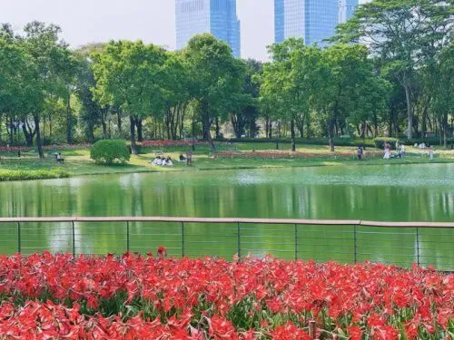 藏在市中心的低调花海,不用跑远,市区通勤间隙、周末闲暇就能去打卡。大片朱顶红环湖种植,火红的花朵热烈奔放,搭配碧绿湖水、葱郁绿树,以及远处的城市高楼,勾勒出一幅“城市春日油画”。