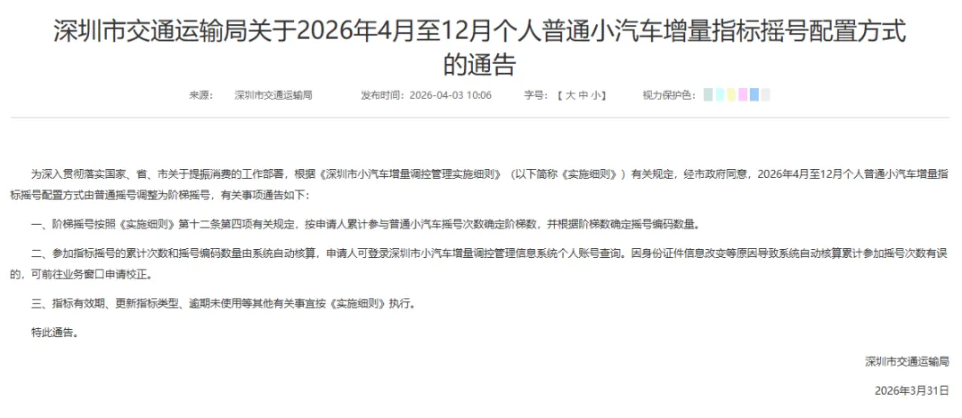 为深入贯彻落实国家、省、市关于提振消费的工作部署,根据《深圳市小汽车增量调控管理实施细则》(以下简称《实施细则》)有关规定,经市政府同意,2026年4月至12月个人普通小汽车增量指标摇号配置方式由普通摇号调整为阶梯摇号,有关事项通告如下: