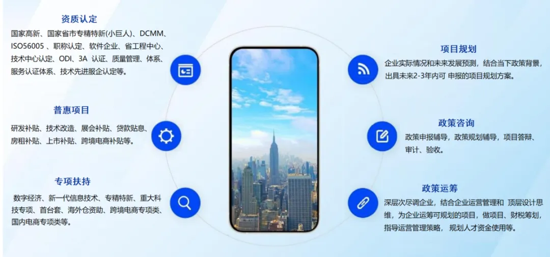 围绕企业“人、财、物、技术”,整合国家、省、市、区四级政策资源。