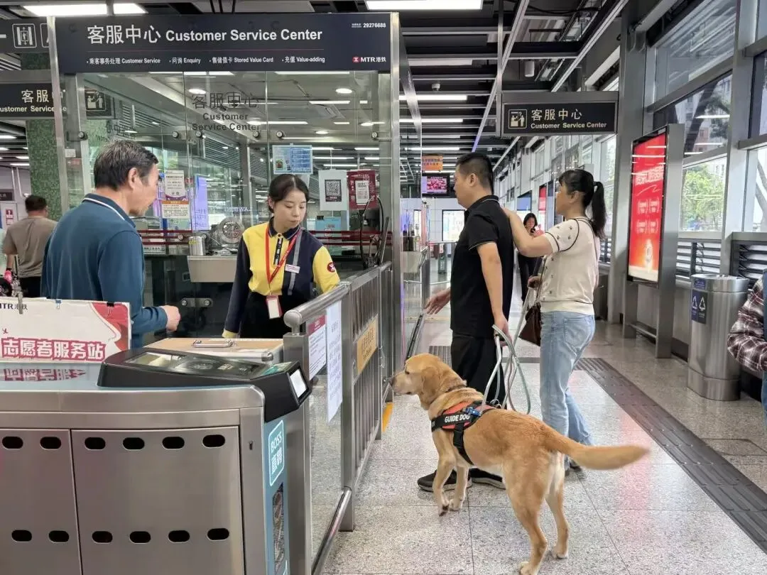 3月30日下午,记者与么传锡夫妻约在上梅林站B口会合,远远就看到夫妻俩带着导盲犬“糖球”,一位路人正热心询问二人是否需要帮助。当么传锡向地铁站的工作人员表达想要寻找盲文地图的时候,对方立即熟练地引导二人从爱心通道进入地铁站,同时用对讲机联系好下一个点接应的同事。