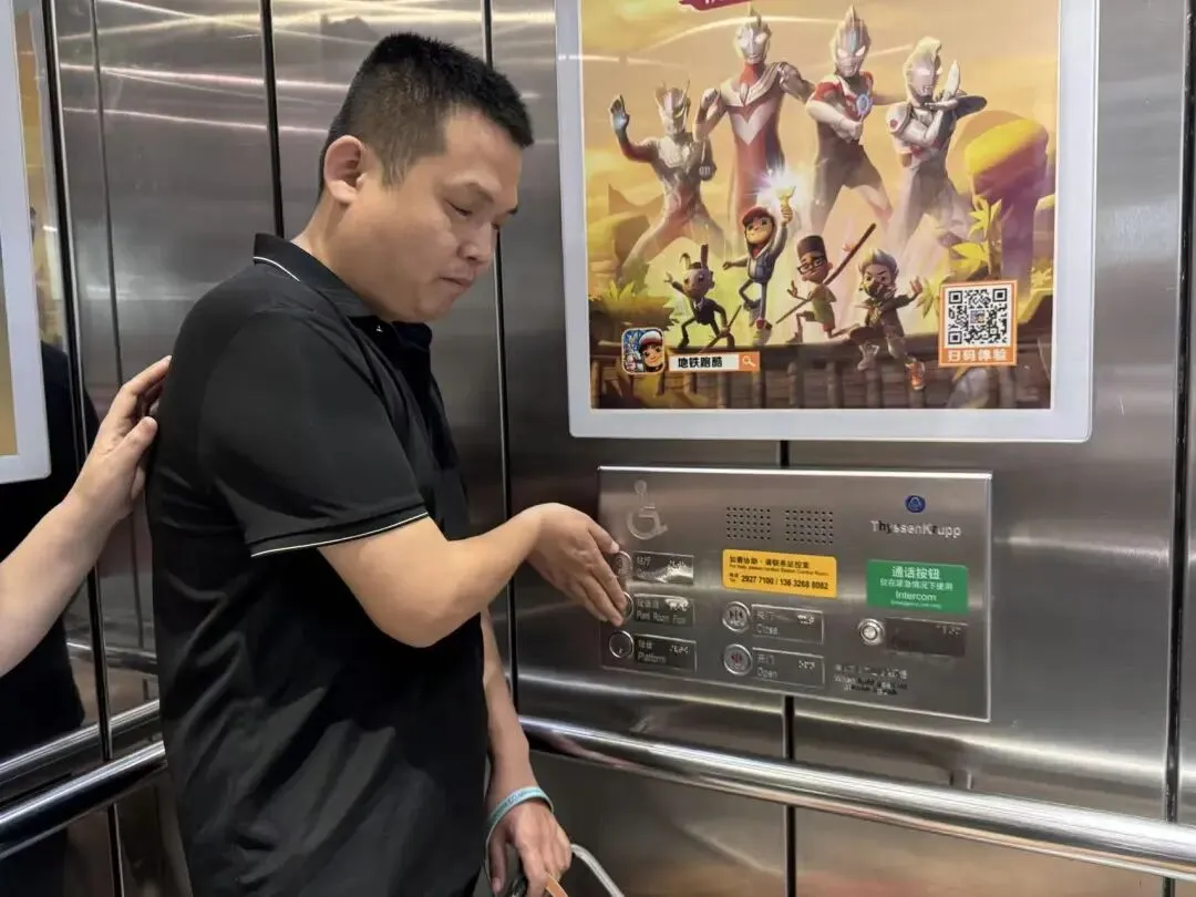 工作人员接力引着“糖球”,“糖球”带着么传锡,阿英手扶着丈夫的肩膀,一行人经过无障碍电梯、步梯、扶手电梯。在无障碍电梯里,么传锡特意去触摸了按键处的盲文标识。记者留意到,在每一处步梯的扶手上,都能看到网友所说的盲文标识。