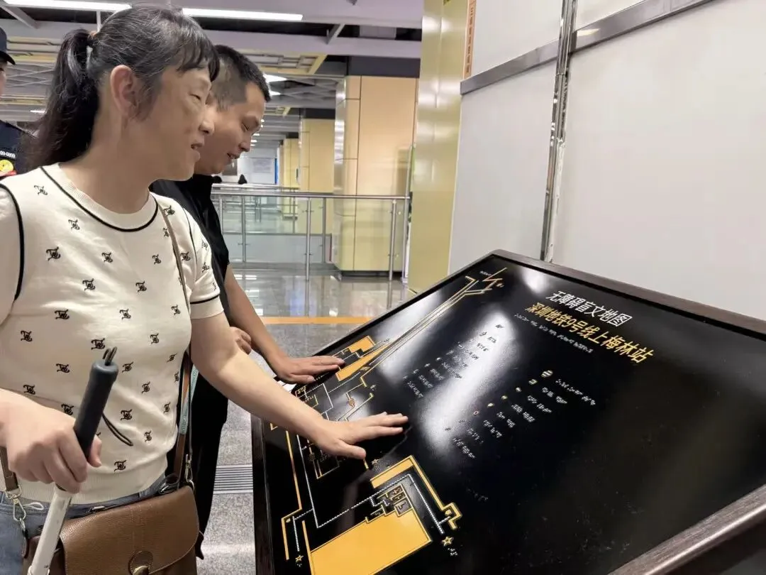 近日,有网友在社交平台分享,深圳地铁扶手上设置了方便盲人阅读的盲文标识,暖心细节引发众多网友点赞。还有网友反映,深圳地铁上梅林站更配备了无障碍盲文地图。3月30日,视障人士么传锡和妻子阿英前往上梅林站专程体验,记者全程陪同。