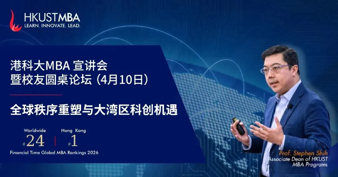 2026年4月10日(周五),香港科技大学MBA项目将举办公开宣讲会,并携手资深校友展开圆桌论坛,从全球视角出发,探讨时代趋势,助你解锁下一步职业跃迁路径。