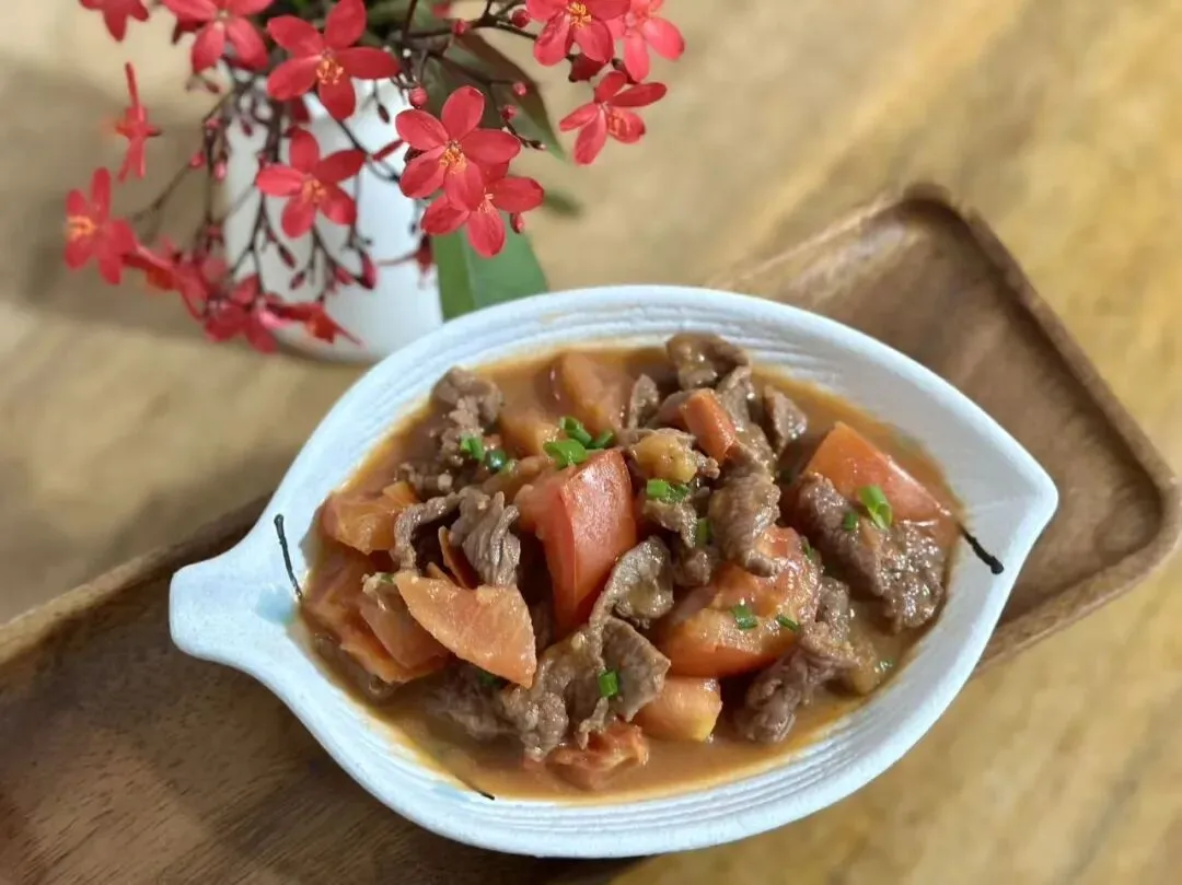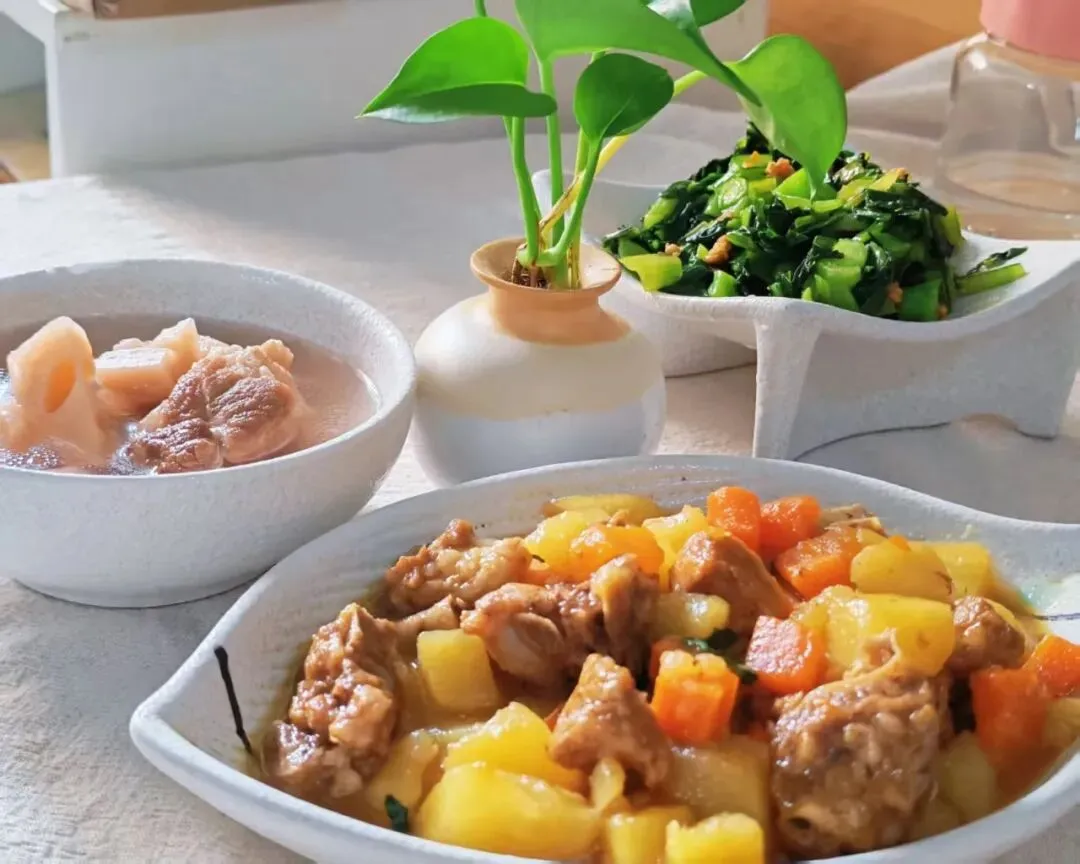 香米饭、番茄牛肉、肉末三丝、鲫鱼萝卜丝汤
