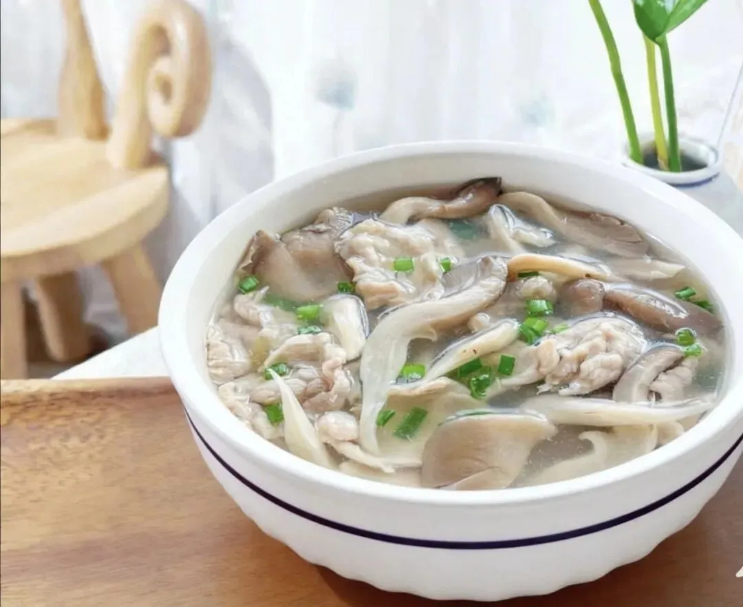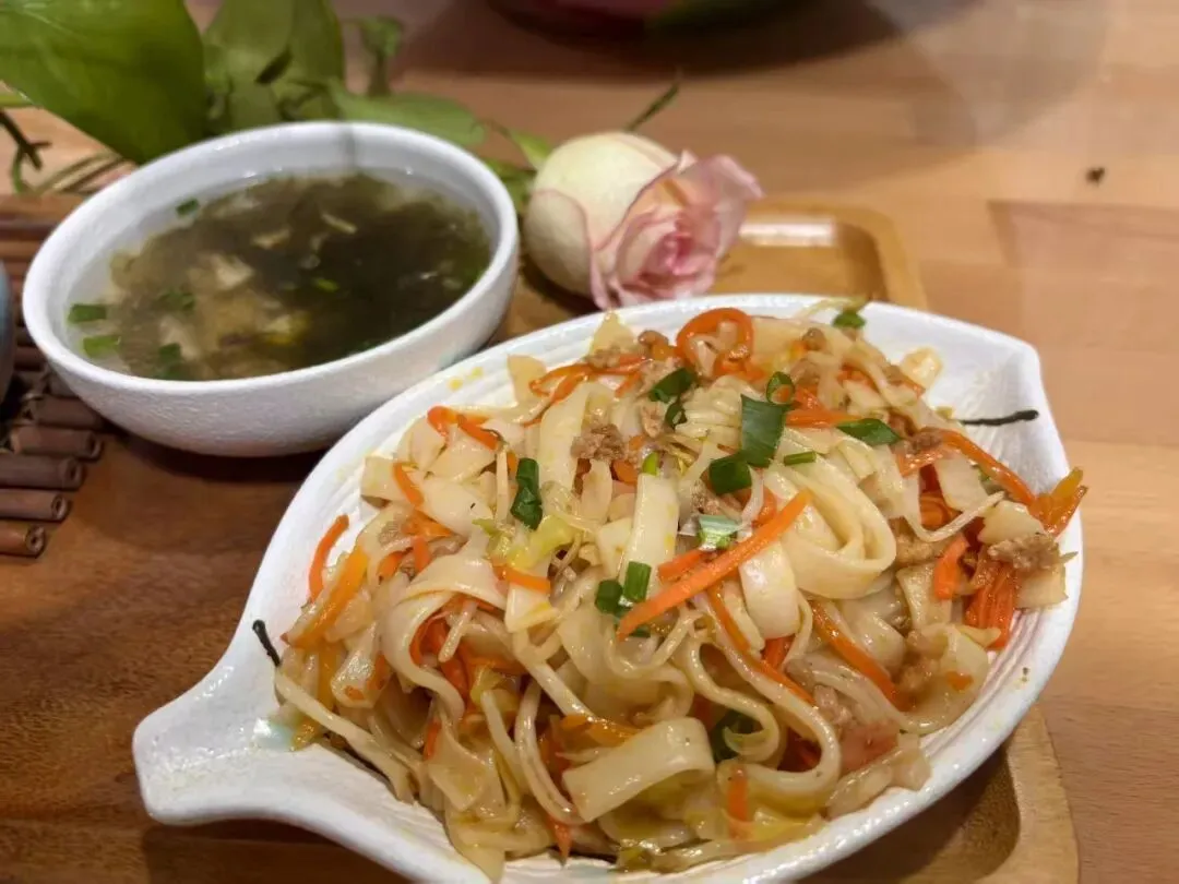 三丝炒河粉 平菇瘦肉汤