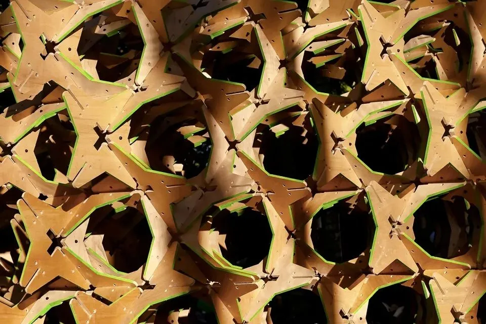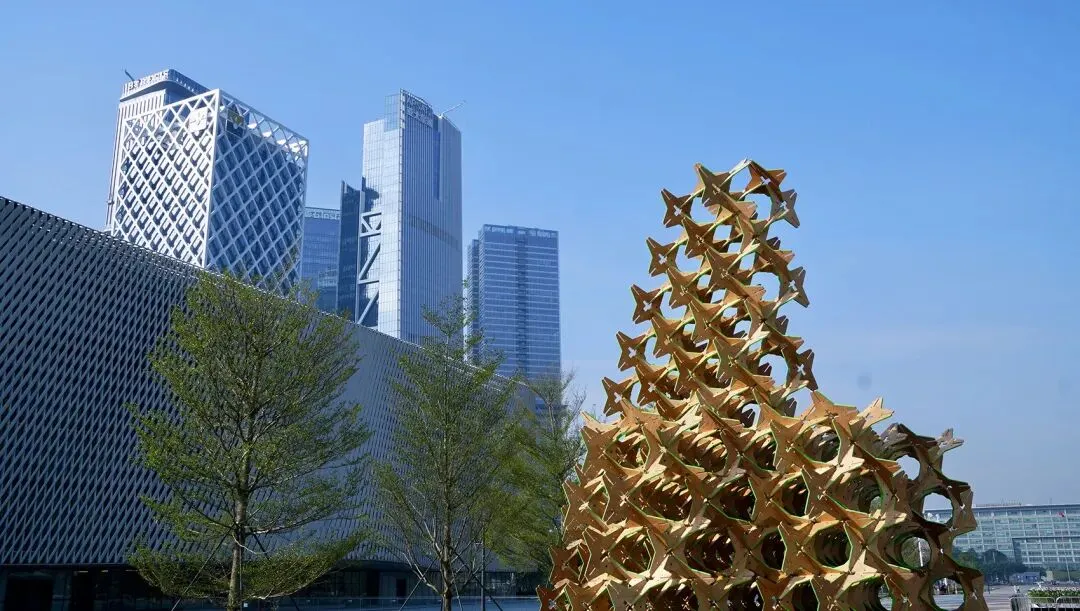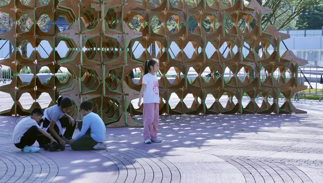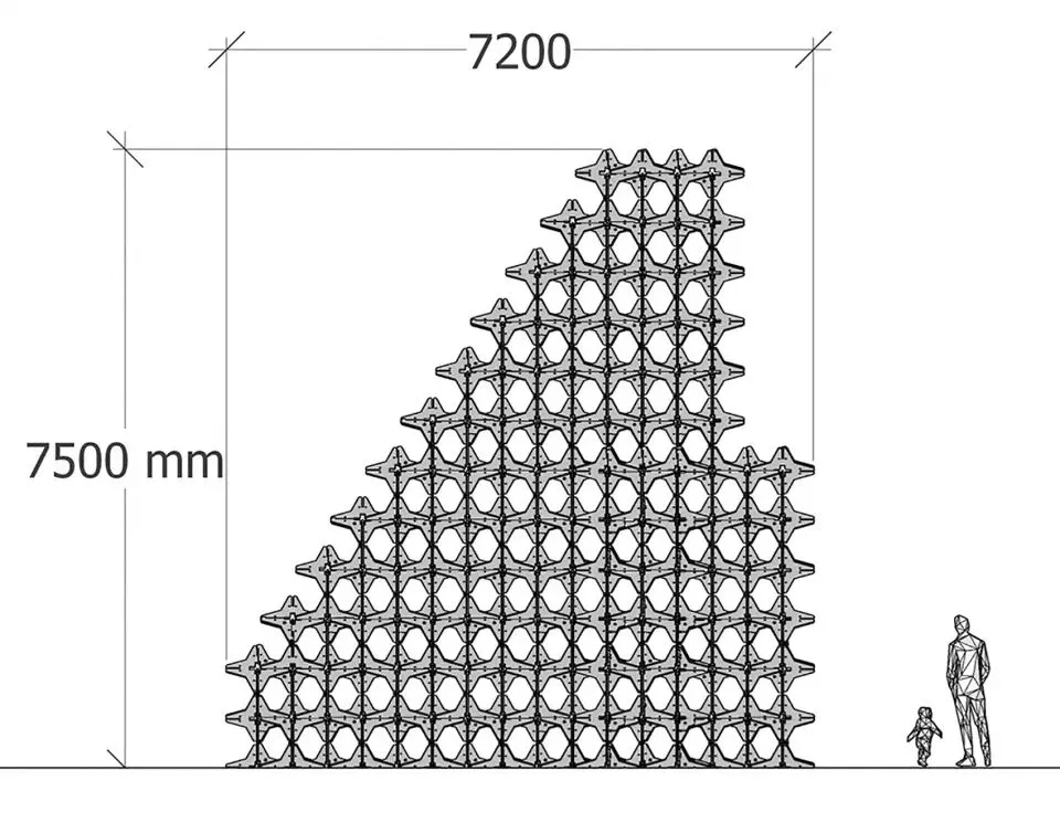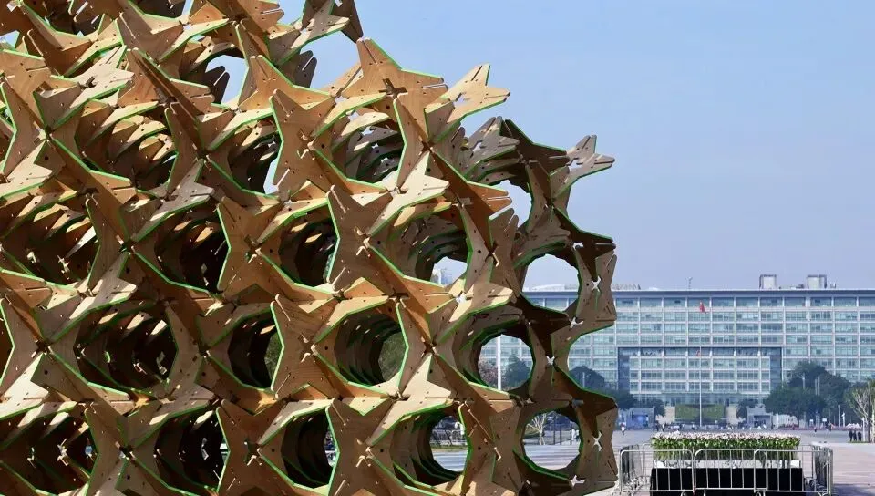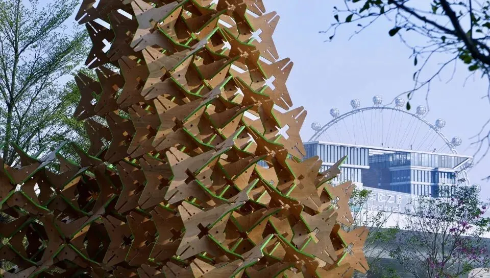 这是一件以可持续材料构建的大型在地装置,通过星型单元的重复与榫卯结构的当代转化,探讨几何形态、力学逻辑与空间感知之间的关系。作品以“自然”“几何”“力学”为关键词,将传统木构智慧与现代材料语言相结合,在正形与负形的交替中生成一种不断演变的视觉秩序。装置并非对自然物的模仿,而是对结构生成过程的呈现——每一块星型单元既承载着力学功能,也参与着空间图形的塑造。