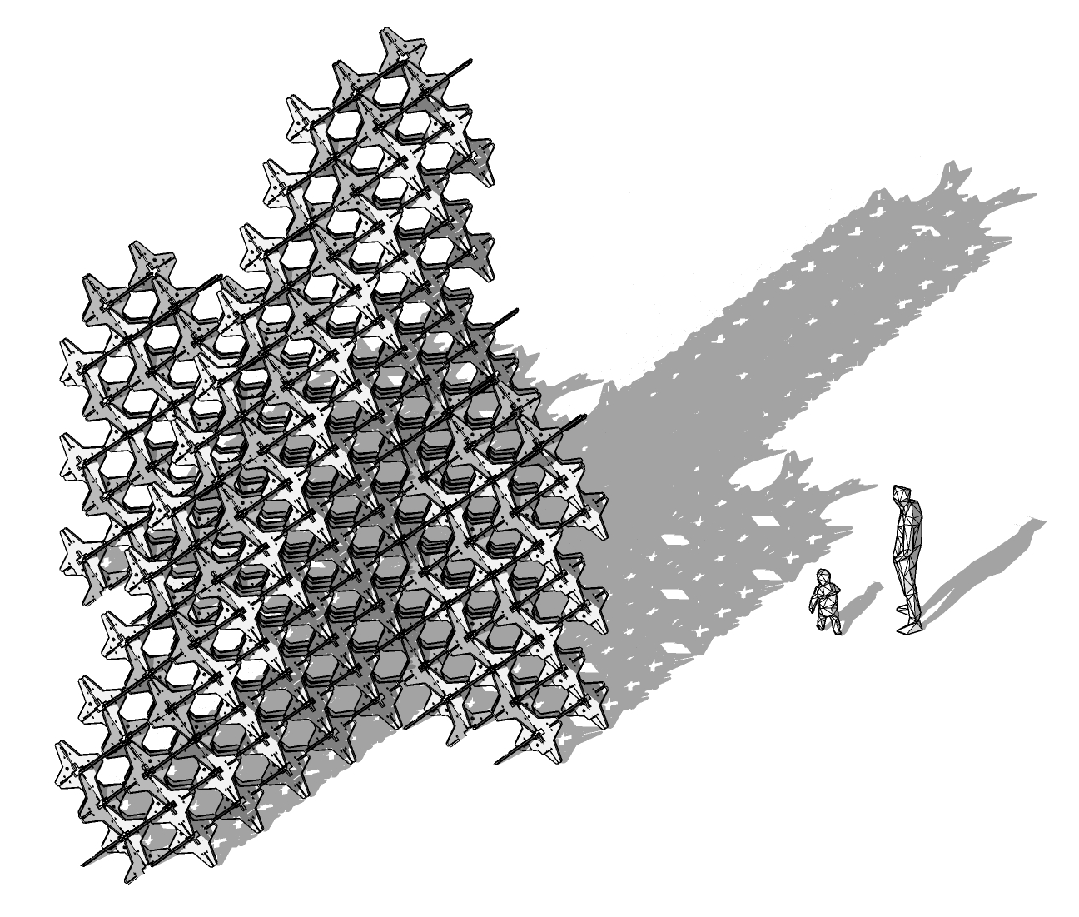 装置的视觉语言建立在正形与负形的辩证关系之上。星型单元的实体(正形)与单元之间的空隙(负形)相互界定,在观众移动的视角下持续变换。阳光穿过结构间隙,在地面和塔身表面投下不断位移的阴影,使负形的轮廓得以显影。正形与负形的交替既体现在静态的几何构成中,也通过光影的介入获得时间维度——午时的投影清晰而锐利,黄昏时分则拉长为离散的斑纹。观众穿行于装置之间,自身的移动不断重组正负形的对比关系,使每一刻的观看都成为唯一的视觉事件。这种秩序与变化并存的视觉经验,揭示出结构本身所具有的生成性潜能。