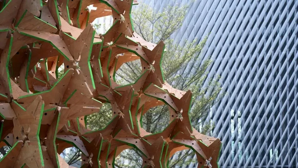 艺术家选用带有天然木纹的可持续环保板材,使工业加工的精确性与木材的原始质感形成对话。材料表面的切割痕迹与裸露纹理,既记录了制作过程,也保留了自然的记忆。装置所在环境的日照、风向与周边植被,将与结构产生的阴影共同构成完整的感官场域。作品通过材料的再生属性与结构的自承重逻辑,将传统工艺的智慧引入当代空间语境,成为连接人工构筑与自然秩序的中间界面。